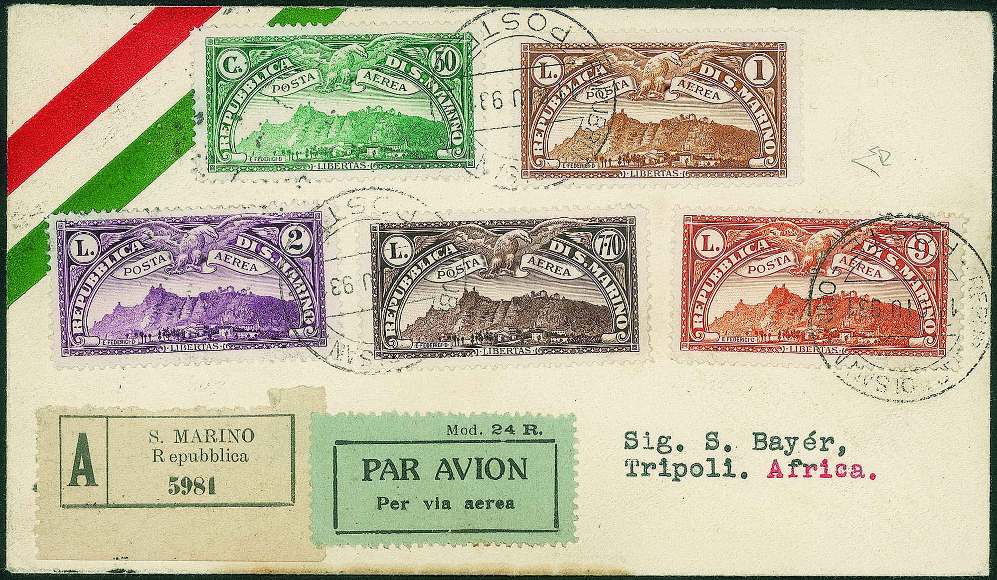 Su due aerogrammi FDC per Tripoli del 11 giugno 1931 (giorno d'emissione) - raro insieme - cert. En. Diena