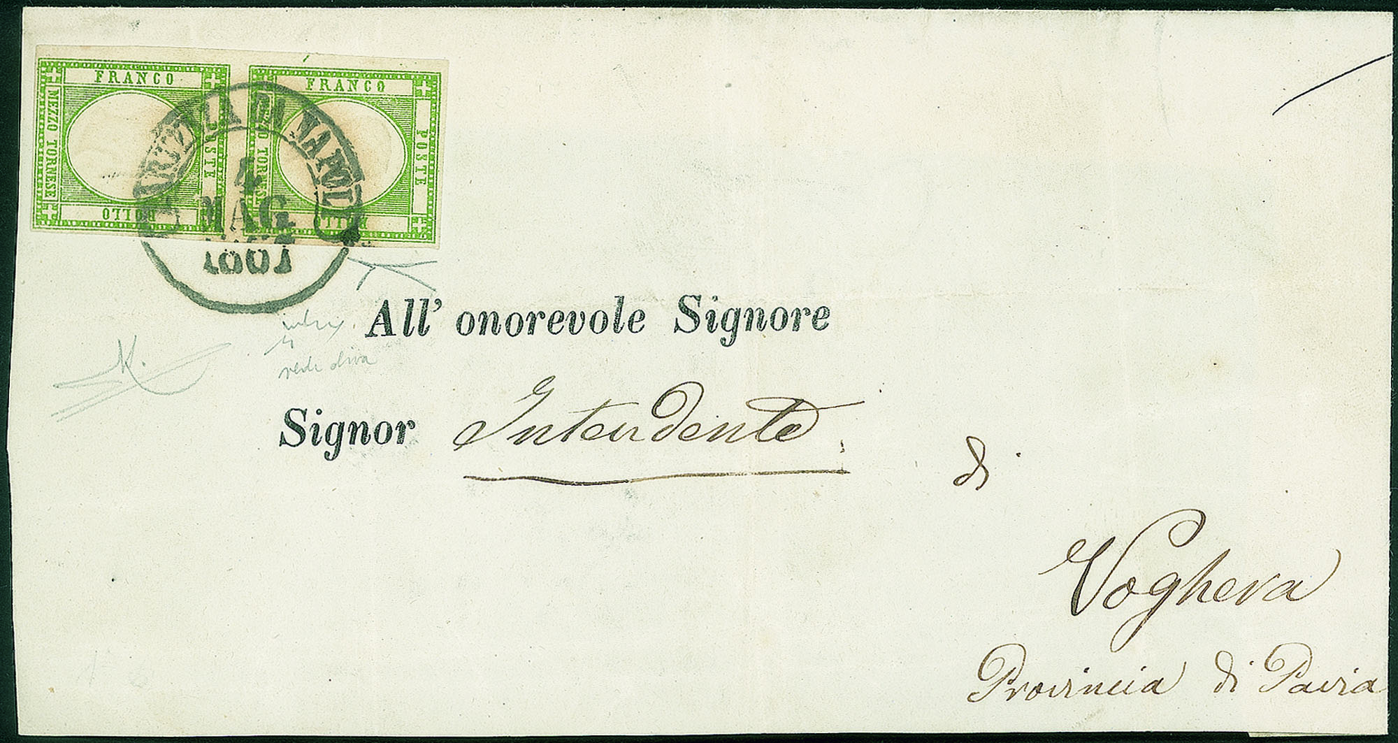 Annullata con bollo Partenza da Napoli 4 MAG.1861 per Voghera - un esemplare interessato da leggera piega - interessante tariffa di primo porto per stampati diretto al di fuori delle province - ottimo aspetto - cert. Bottacchi
