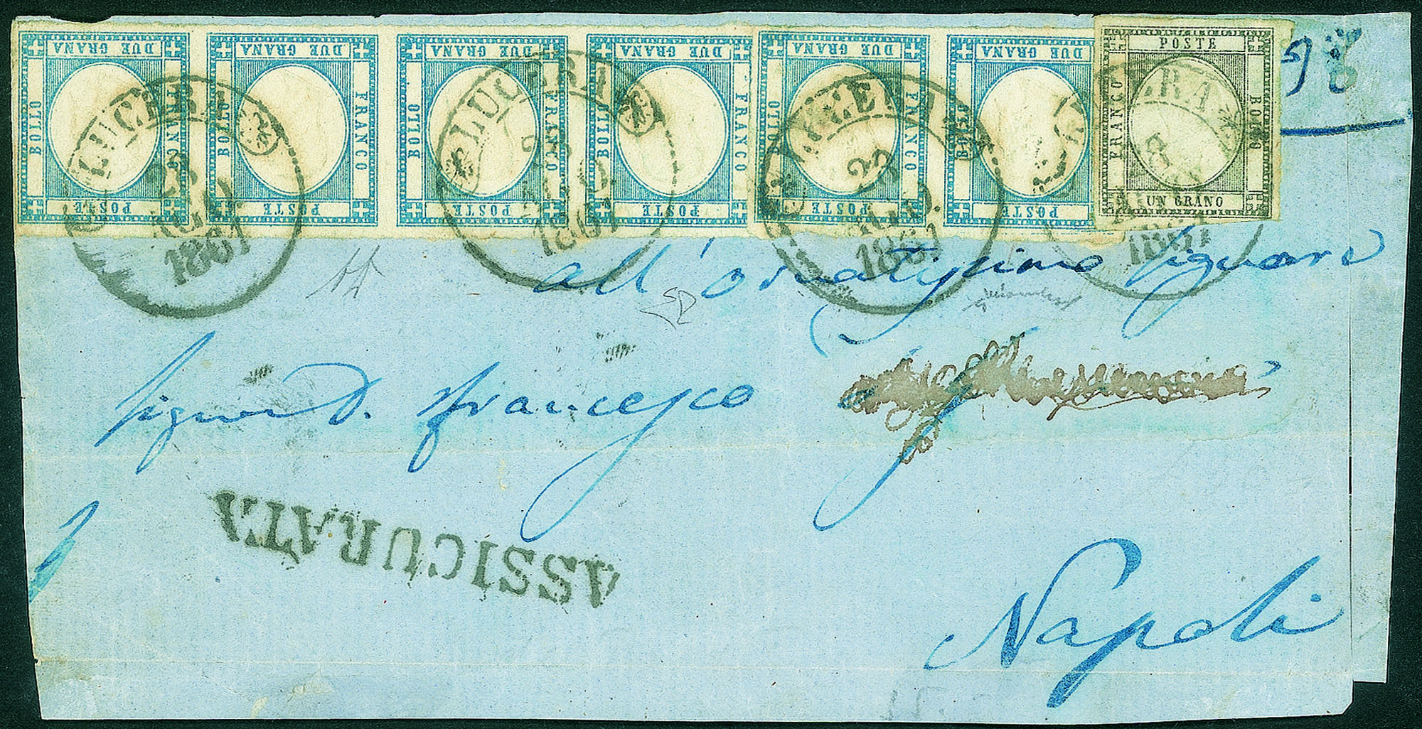 Antichi Stati Italiani - Napoli - 1861 - striscia di quattro + coppia del 2 grana azzurro chiaro + 1 grano grigio scuro (20 + 19a)