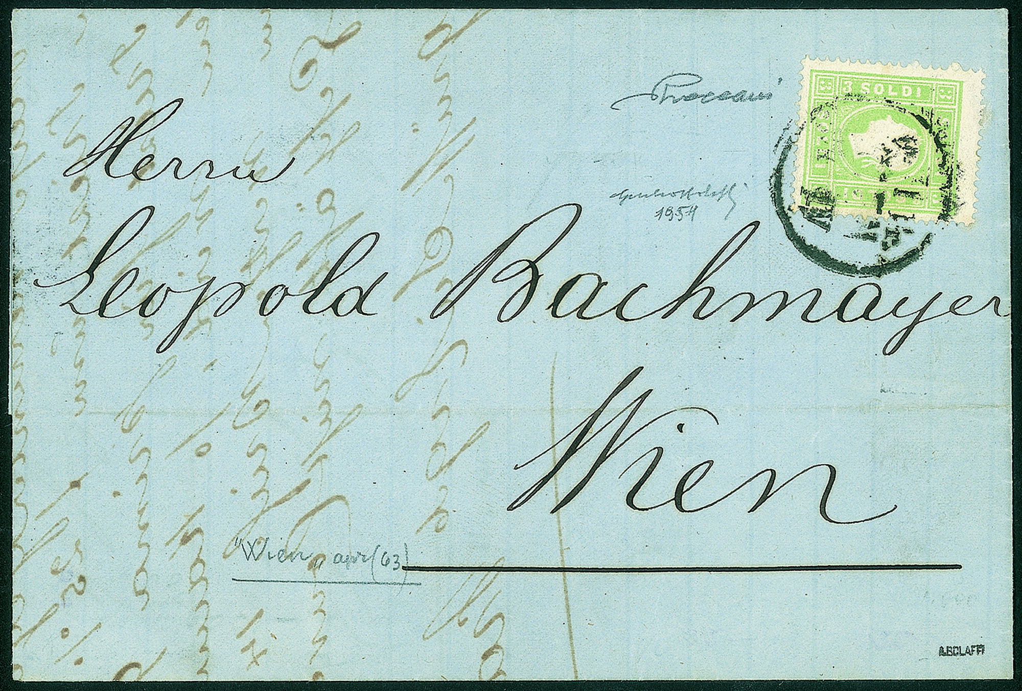 Scritta a Venezia e portata per via privata a Vienna e qui impostata per città il 24.4.63 - uso isolato - raro - cert. Vaccari + cert. Bolaffi