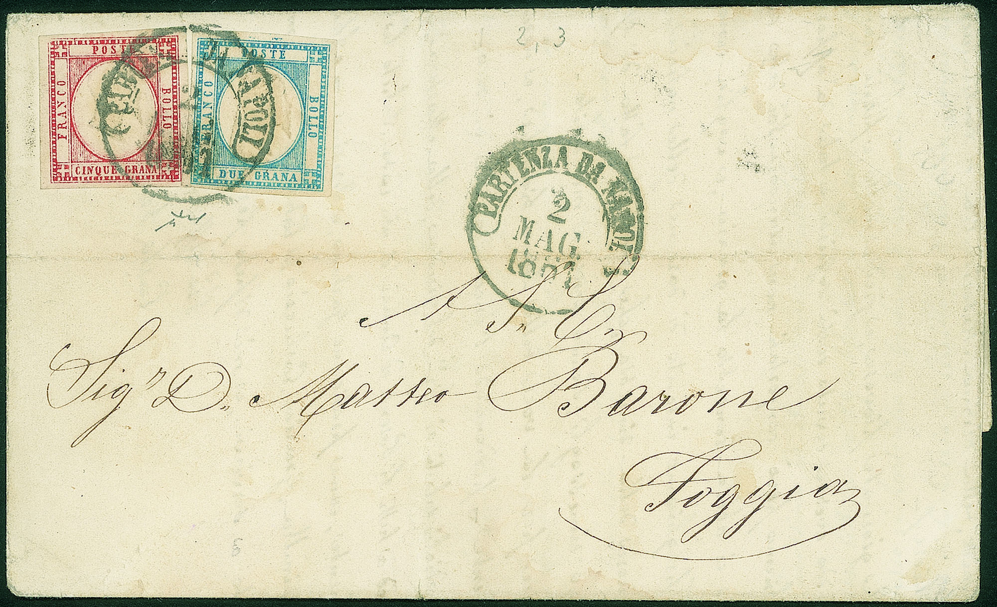 Antichi Stati Italiani - Napoli - Lettera affrancata con 5 grana rosso carminio + 2 grana azzurro chiaro
