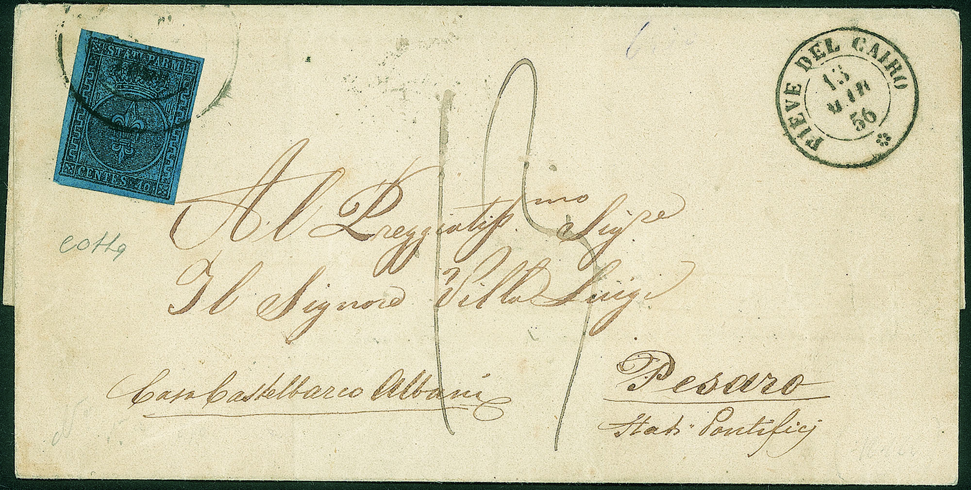 Per Pesaro e affrancata con c.40 azzurro, erroneamente instradata con annulli di transito di PIEVE DEL CAIRO 13 MAR.56 sul fronte e al verso i bolli di Alessandria, Ambulante Torino-Genova e Genova del giorno successivo, tassa in arrivo nello Stato Pontificio per 13 baiocchi, bollo di arrivo del 18 marzo, cert. G. Colla