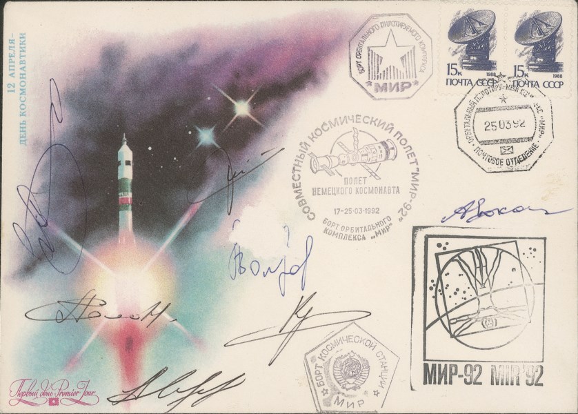 Cosmogramma del volo cooperato Russia Germania con i vari annulli della missione - firme autografe degli astronauti Krikalyov Volkov Viktorenko Kaleri Soloviev Avdeev e Tognini - ottima qualità