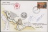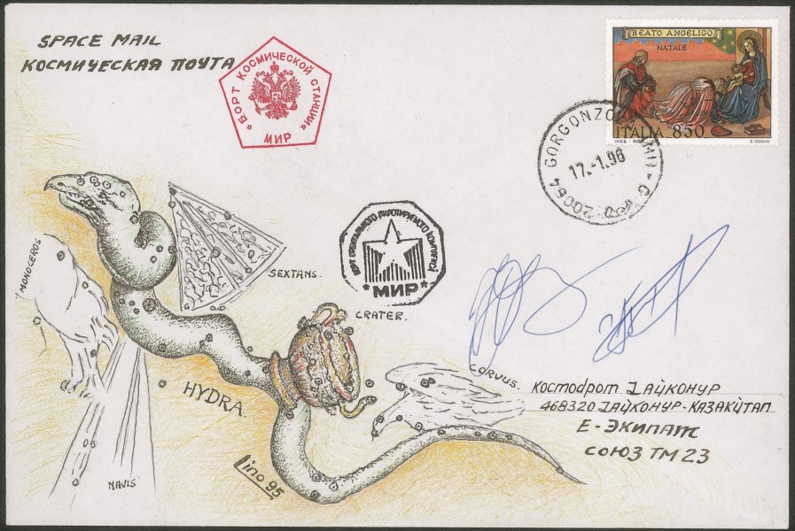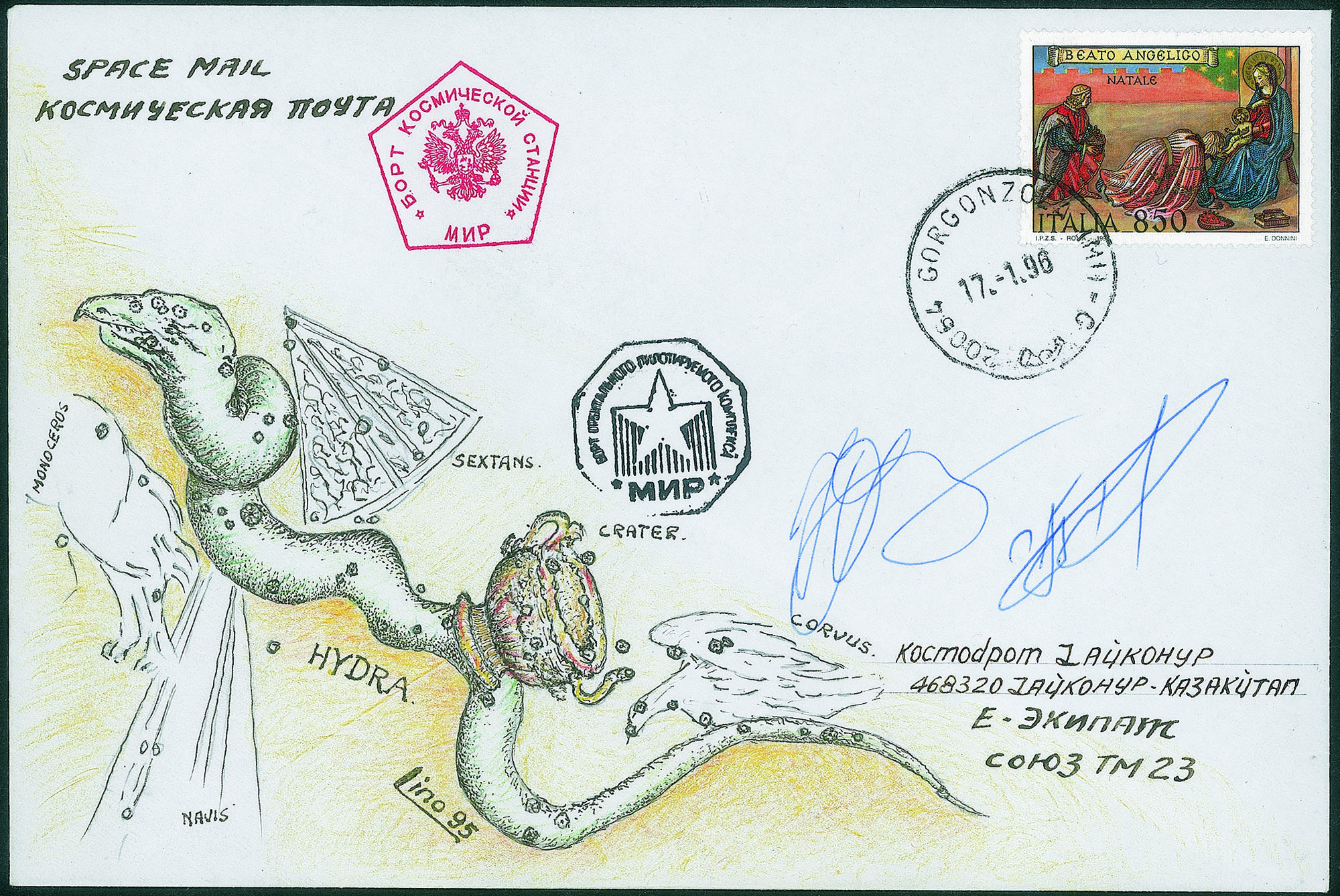 Cosmogramma n.5/10 (manoscritto al verso) spedito il 17.1.1996 da Gorgonzola (MI) all'equipaggio della Soyuz TM-23 e trasportato sulla stazione orbitale dalla stessa navicella (lancio 21.2.1996, aggancio Soyuz TM-23/Mir 23.2.1996) - affrancato in tariffa per l¿estero timbrato con bollo ottagonale stellare nero e il nuovo bollo pentagonale rosso Bordo Stazione Orbitale Mir per poi ritornare sulla Terra sempre con la Soyuz TM-23 - firme autografe dell¿equipaggio: Y.Onufrienko e Y.Usachev - il bozzetto della costellazione Hydra è opera del pittore L. Brioschi - documento raro - ottima qualità - cert. di autenticità