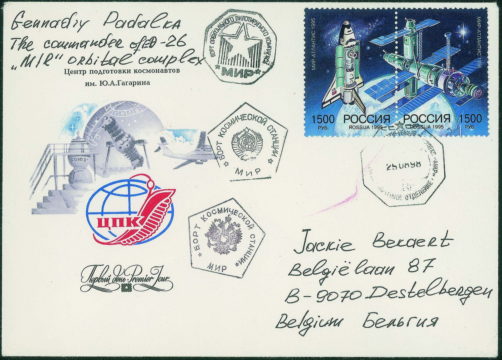 Cosmogramma con posta privata Spazio-Terra (uno dei 13 conosciuti) trasportato sulla Terra dalla Soyuz TM-27, scritto dal cosmonauta Gennadi Padalka a bordo della stazione - lettera annullata con gli annulli di bordo: l'ottagonale CC*CP 25.08.98, giorno del distacco Soyuz TM-27/Mir, bollo pentagonale, 2 tipi sulla busta e ottagonale stellare nero - la busta riporta al verso anche il bollo a secco della spedizione 26 - ottima qualità