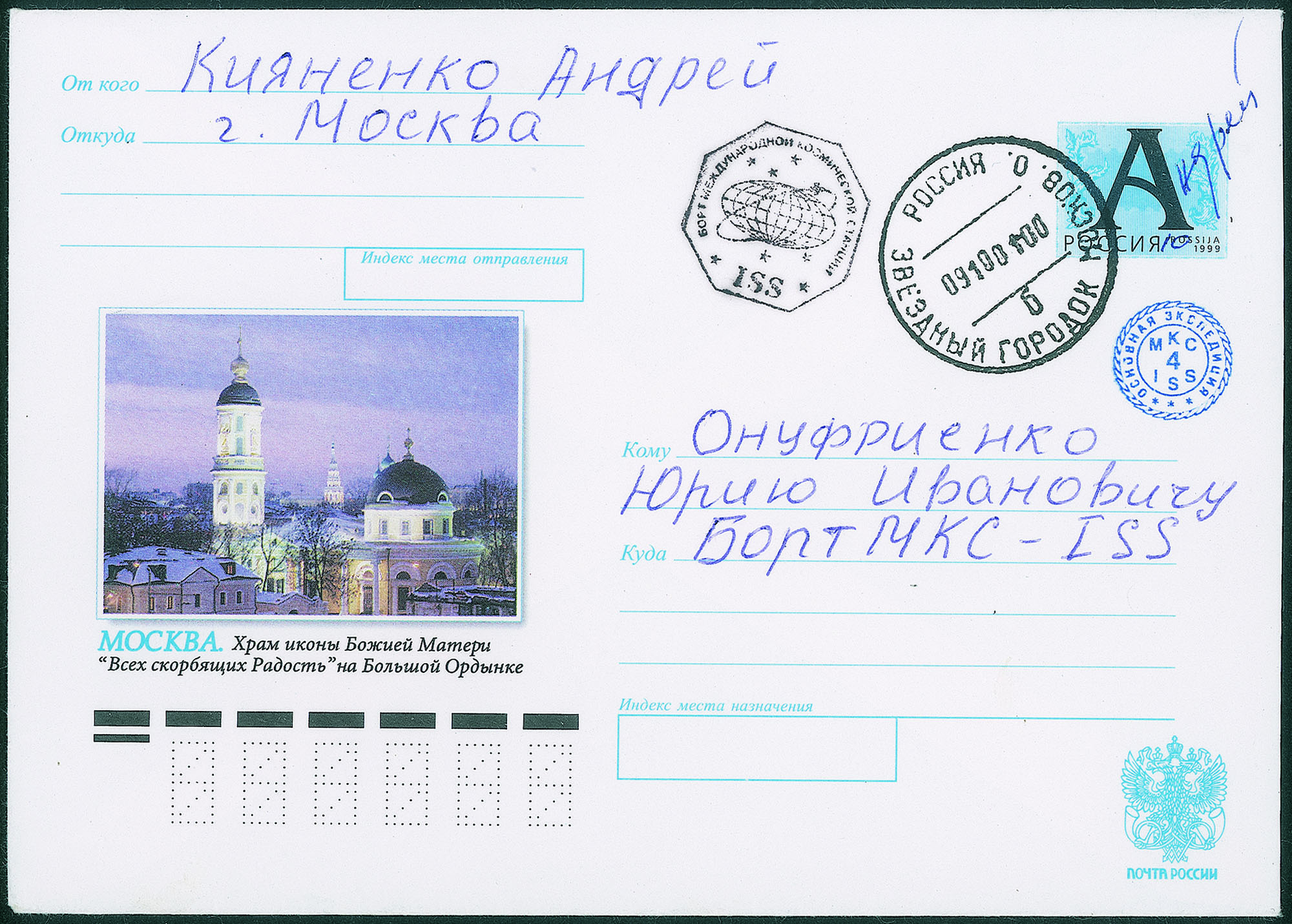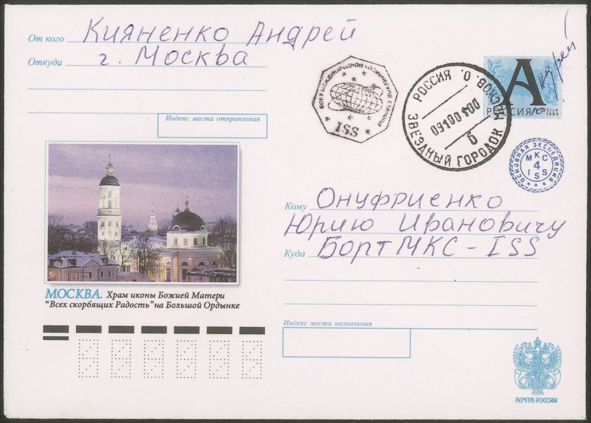 Cosmogramma spedito dalla Terra alla Stazione Spaziale Internazionale a bordo della navicella di rifornimento senza equipaggio Progress Ml-7 (25 lettere trasportate) con messaggio manoscritto (poesia di Andrei Kiyanenko spedita prima e indirizzata a Y.Onufriyenko) - la lettera e il testo furono timbrati da Y.Onufriyenko al suo arrivo con l'STS-108 con il timbro personale della Spedizione 4 e con gli annulli di bordo (solo 8 di queste lettere portano la data 7.12.2001 mentre altre 17 hanno la data del 6.12.2001 orario del Houston Control Center e di queste 25 lettere solo 10 contengono la poesia) - la lettera ritornò sulla Terra a bordo dello Shutte Endeavour STS-108 il 17.12.2001 - ottima qualità e insieme di aspetti alquanto rari - cert. Hopferwieser