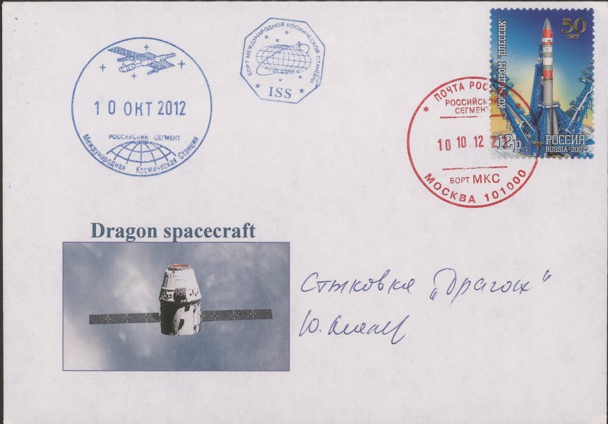 Cosmogramma timbrato con gli annulli di bordo della Stazione Spaziale Internazionale datati 10.10.2012, giorno in cui la navicella americana di rifornimento senza equipaggio Dragon CRS-1 agganciò la ISS - trattasi del primo volo commerciale sulla ISS di una navicella di rifornimento senza equipaggio Dragon - firma autografa del cosmonauta russo Y.Malenchenko, a bordo della ISS il giorno dell'aggancio della navicella Dragon CRS-1 - rara e di ottima qualità