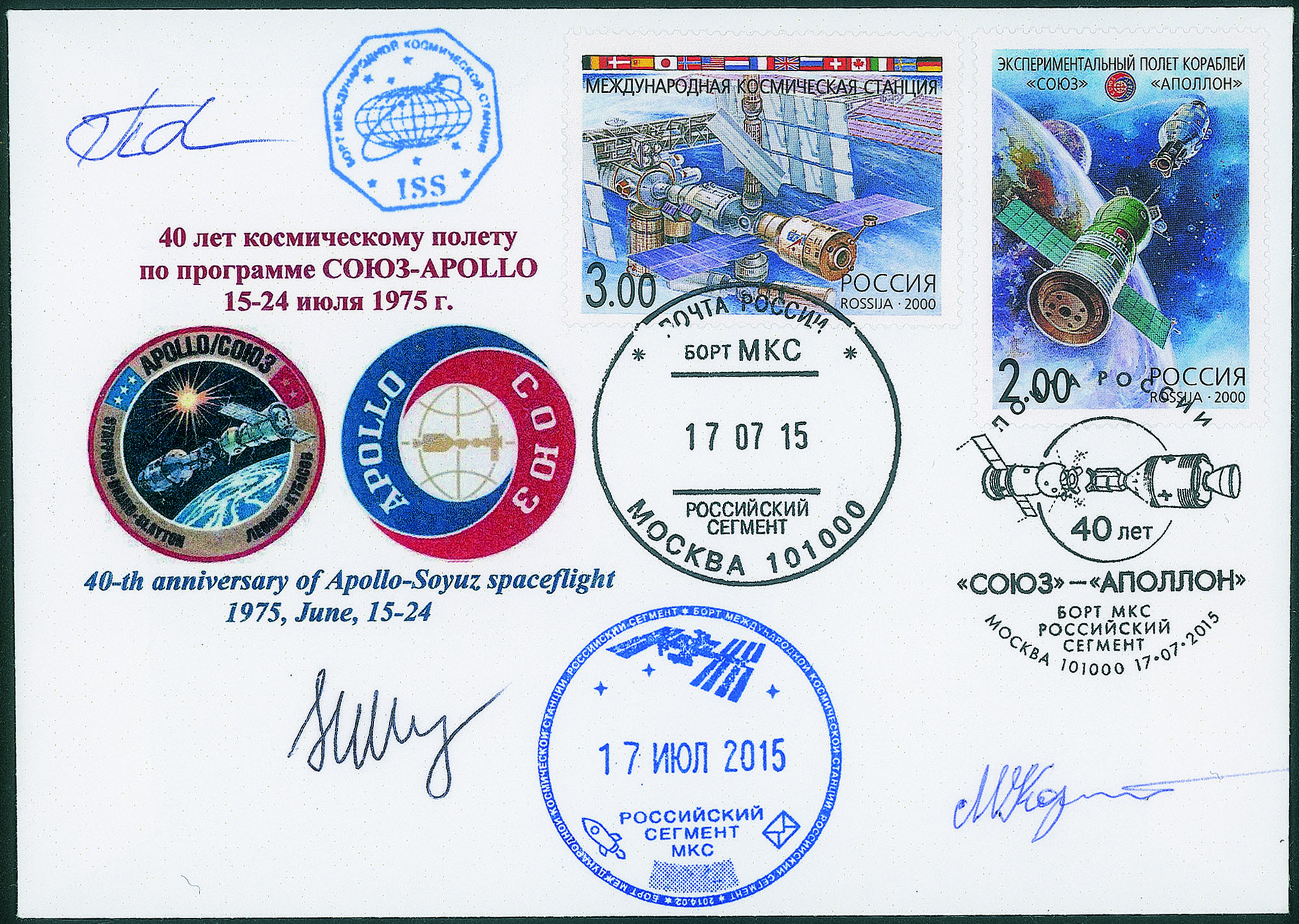 Cosmogramma commemorativo Roskosmos del 40° anniversario della missione spaziale Apollo-Soyuz annullato a bordo della Stazione Spaziale - firme autografe di tutto l'equipaggio della Soyuz TMA-16M e componenti della Spedizione 44: G.I.Padalka e M.B.Korniyenko (Russia), SJ.Kelly (USA) - sono note circa 60 lettere con il timbro commemorativo dei 40 anni della missione spaziale Apollo-Soyuz - molto bella e di ottima qualità - cert. Hopferwieser