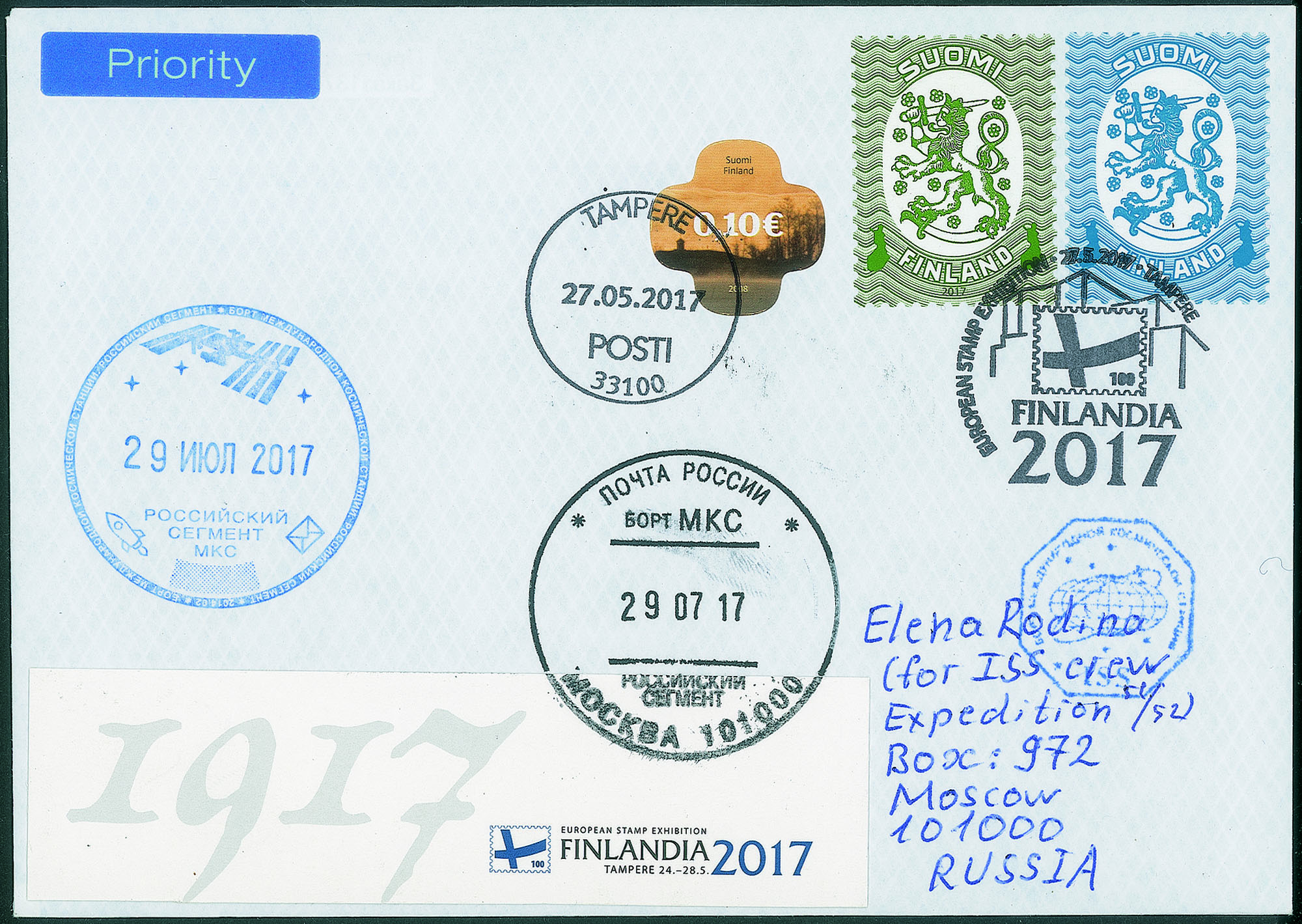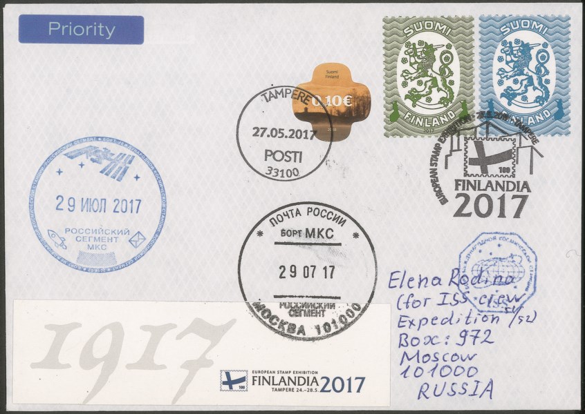 Cosmogramma spedito dalla Terra alla Stazione Spaziale Internazionale a bordo della navicella russa Soyuz MS-05 con lettera manoscritta - prima la lettera fu spedita dall'esposizione Finlandia 2017 in Russia (forse si tratta della prima lettera spedita dalla Finlandia alla ISS) poi arrivata a bordo della ISS- lettera e testo furono timbrati con gli annulli di bordo - interessante e di ottima qualità - foto di autenticità dallo spazio - cert. Rodin