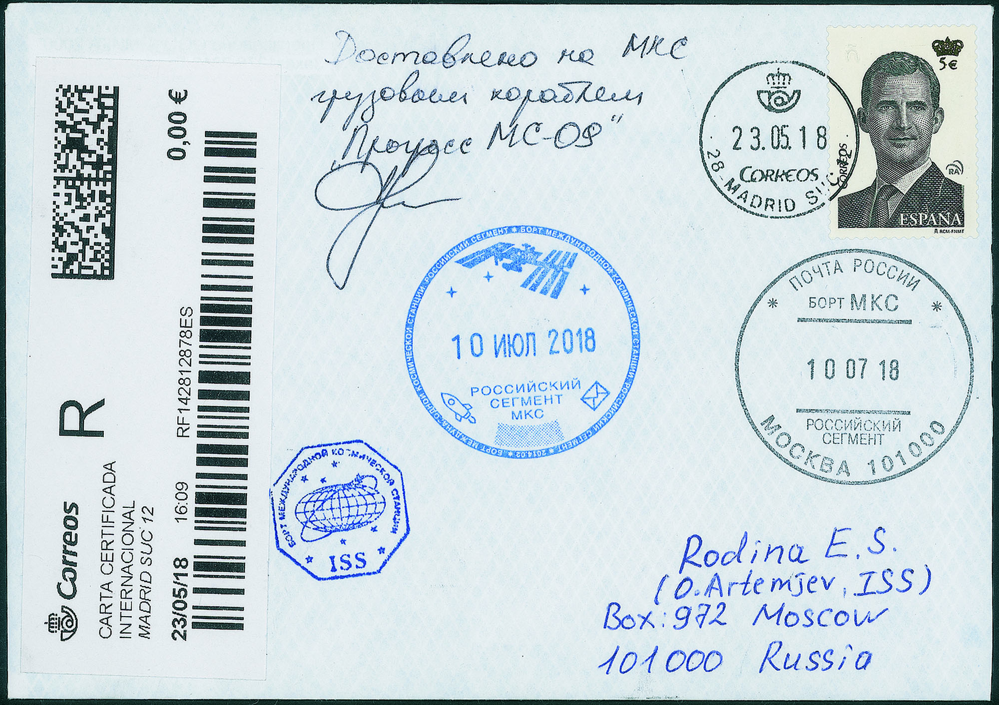 Cosmogramma spedito dalla Terra alla Stazione Spaziale Internazionale a bordo della navicella di rifornimento senza equipaggio Progress MS-09 - prima la lettera fu spedita da Madrid (Spagna) per raccomandata in Russia - lettera timbrata con gli annulli di bordo - è considerato il viaggio per la ISS più veloce mai compiuto - il cosmonauta O.Artemyev ha scritto una nota sulla busta: È consegnata alla ISS dalla navicella Progress MS-09 - molto bella e di ottima qualità - foto di autenticità dallo spazio - cert. Rodin