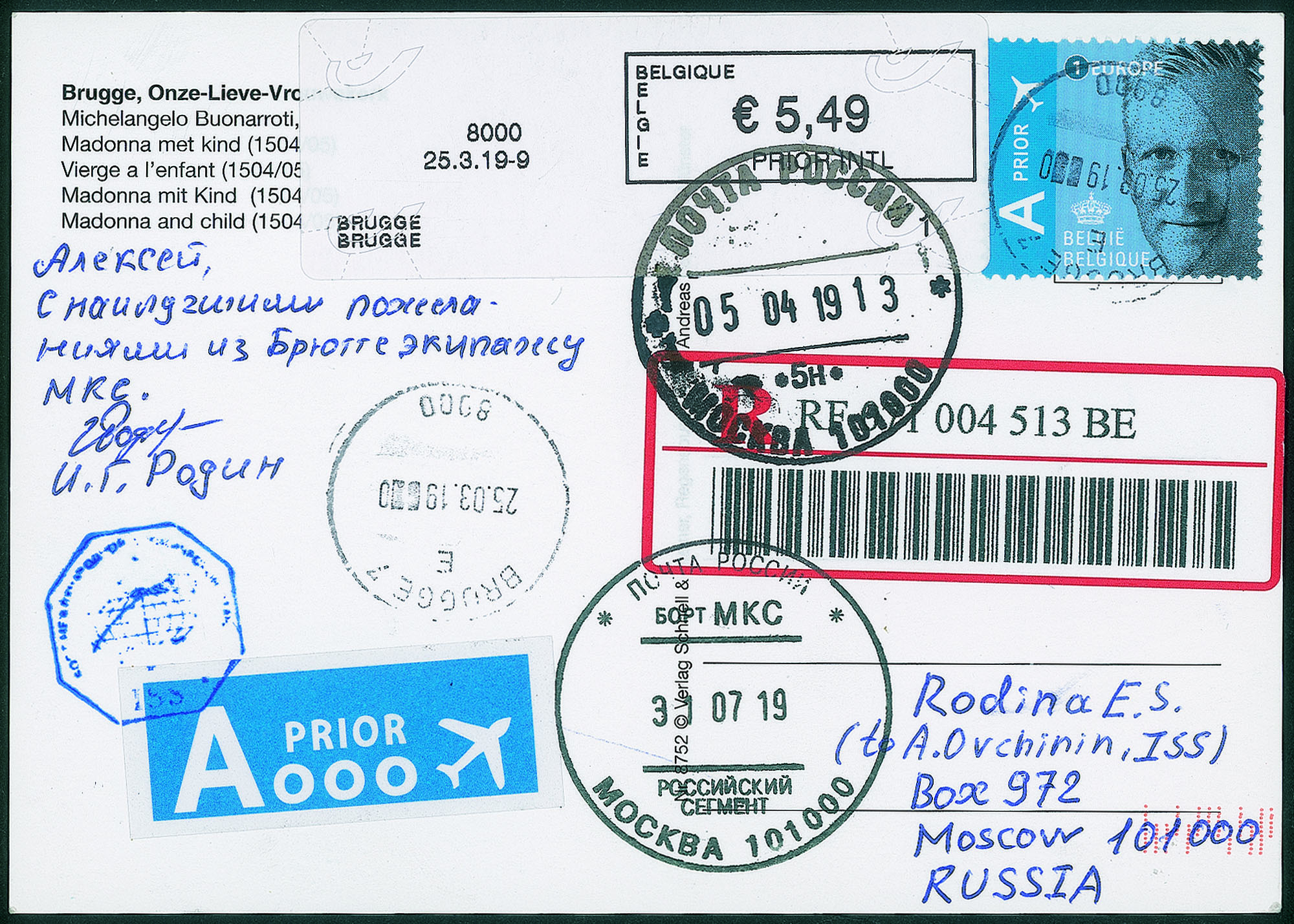 Cartolina spedita dalla Terra alla Stazione Spaziale Internazionale a bordo della navicella di rifornimento senza equipaggio Progress MS-12 - prima la cartolina fu spedita da Bruges (Belgio) per raccomandata in Russia poi a bordo della ISS - la cartolina è timbrata con gli annulli di bordo - ottima qualità - foto di autenticità dallo spazio - cert. Rodin
