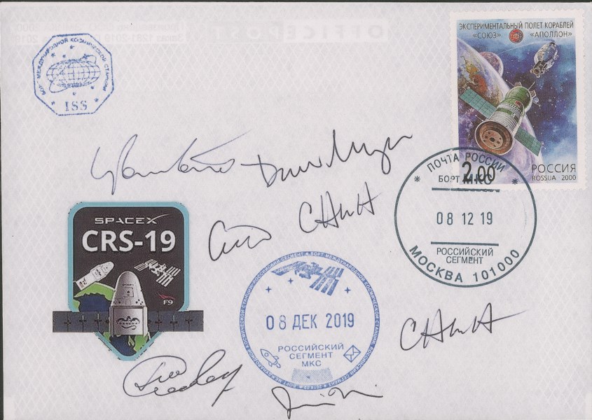 Cosmogramma timbrato con gli annulli di bordo datati 08.12.2019, giorno in cui la navicella americana di rifornimento senza equipaggio Dragon CRS-19 agganciò la ISS - 6 firme autografe: equipaggio Soyuz MS-13, A.Skvortsov (Russia), Luca Parmitano (Italia) e A.Morgan (USA); equipaggio Soyuz MS-15, O.Skripochka (Russia), J.Meir (USA) e Hazzaa Al Mansoori (UAE) - ottima qualità