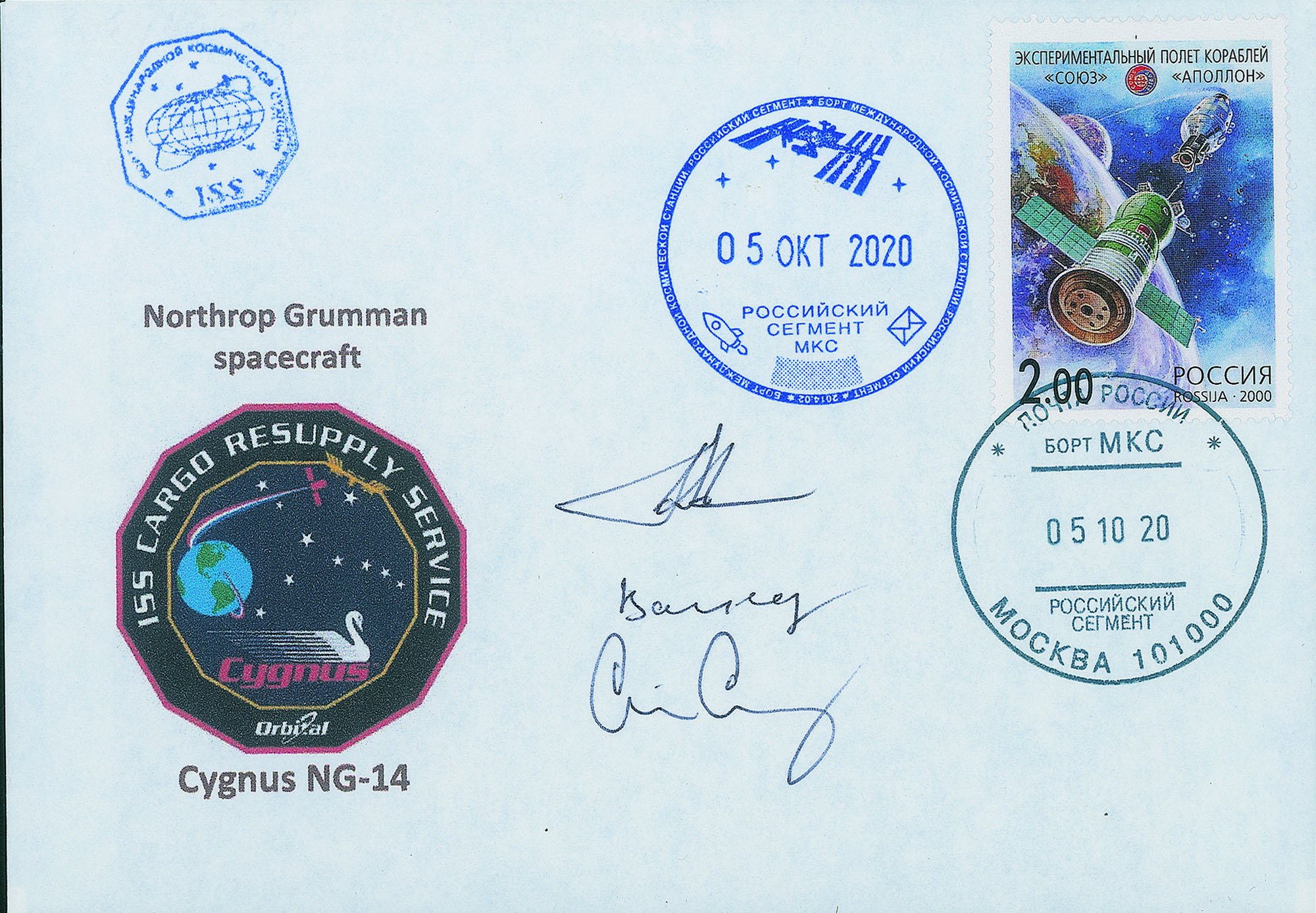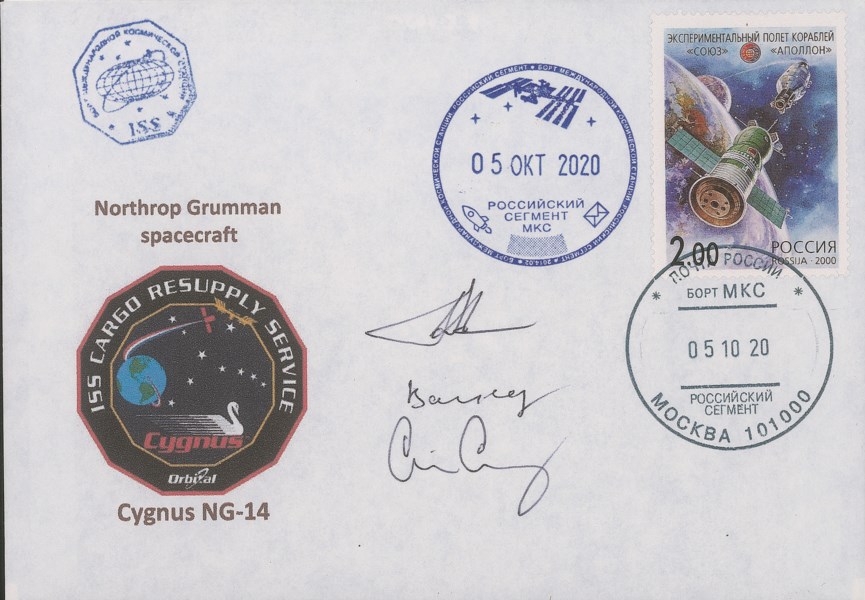 Cosmogramma timbrato con gli annulli di bordo datati 05.10.2020, giorno dell'aggancio della navicella di rifornimento senza equipaggio americana Cygnus NG-14 alla ISS - firme autografe dei 3 astronauti (Soyuz MS-16) a bordo della ISS il 05.10.2020: C.Cassidy (USA); A.lvanishin e I.Vagner (Russia) - ottima qualità
