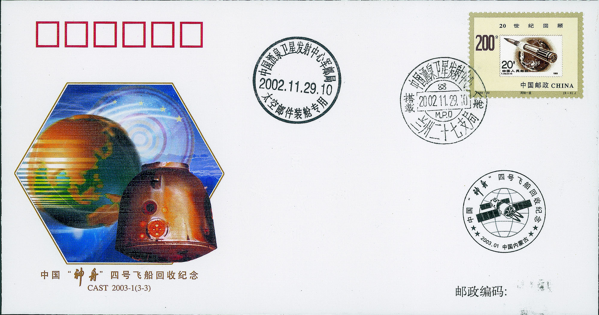 Quarta missione (30.12.2002 - 5.1.2003) di un veicolo spaziale di tipo Shenzhou del programma spaziale cinese, l'ultima senza equipaggio umano e che rappresentò il test finale prima del primo volo umano cinese - cosmogramma ufficiale n.0212378 di 400 buste volate (n.0212001-0212400), emesso dalla China Academy of Space Technology (CAST) con anullo del 29.11.2002, bollo a secco dell'ufficio notarile e dell'8.1.2003 al verso - la busta volata è accompagnata da 2 buste commemorative - rara e di ottima qualità - cert. notarile in cinese