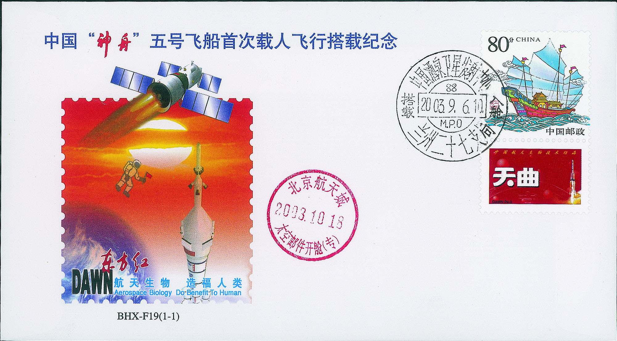 Primo volo umano cinese (15.10.2003), comandante Yang LiWei - cosmogramma ufficiale n.138 di 200 emesso dal Beijing Aerospace Post Office con ann. del 6.9.2003 e 18.10.2003 al verso - al recto in rosso il raro red spaceship cachet 2003.10.18 + bollo a secco dell'ufficio notarile - allegata busta commemorativa con data di lancio del 15.10.2003 emessa da CMSE con firma autografa del comandante Yang LiWei - la Cina diventò così la terza nazione al mondo a effettuare voli spaziali umani - rara e di ottima qualità - cert. notarile in cinese