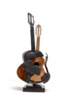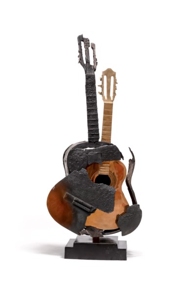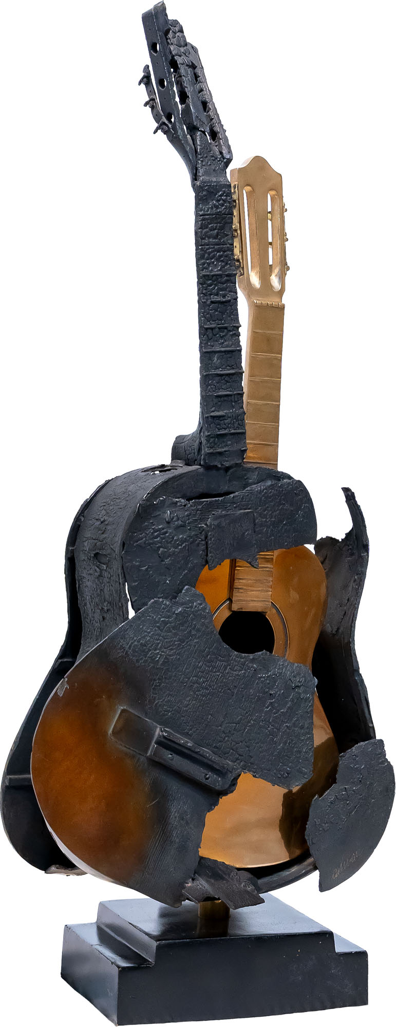 Sculpture composed of a polished bronze guitar wrapped in a cast of a burned guitar in black and brown patinated bronze, ed. 6/8