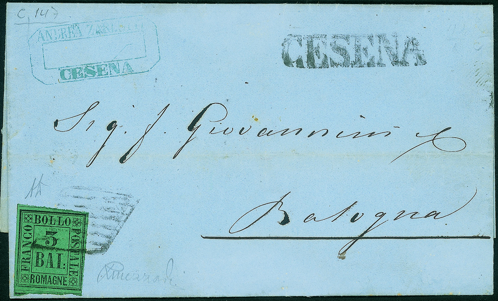 Antichi Stati Italiani - Romagne - 3 bai (4) isolato su lettera da Cesena a Bologna del 9.11.1859