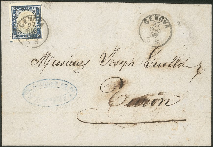 Antichi Stati Italiani - Sardegna - Lettera da Genova 27.12.59 affrancata con 20 cent (15Aa)