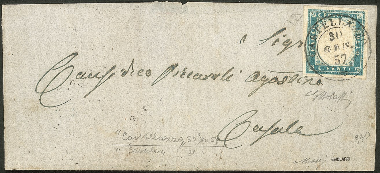 Splendido esemplare del 20 cent cobalto con grandi margini (15) su bustina per Casale del 30.1.57 - cert. G. Bolaffi