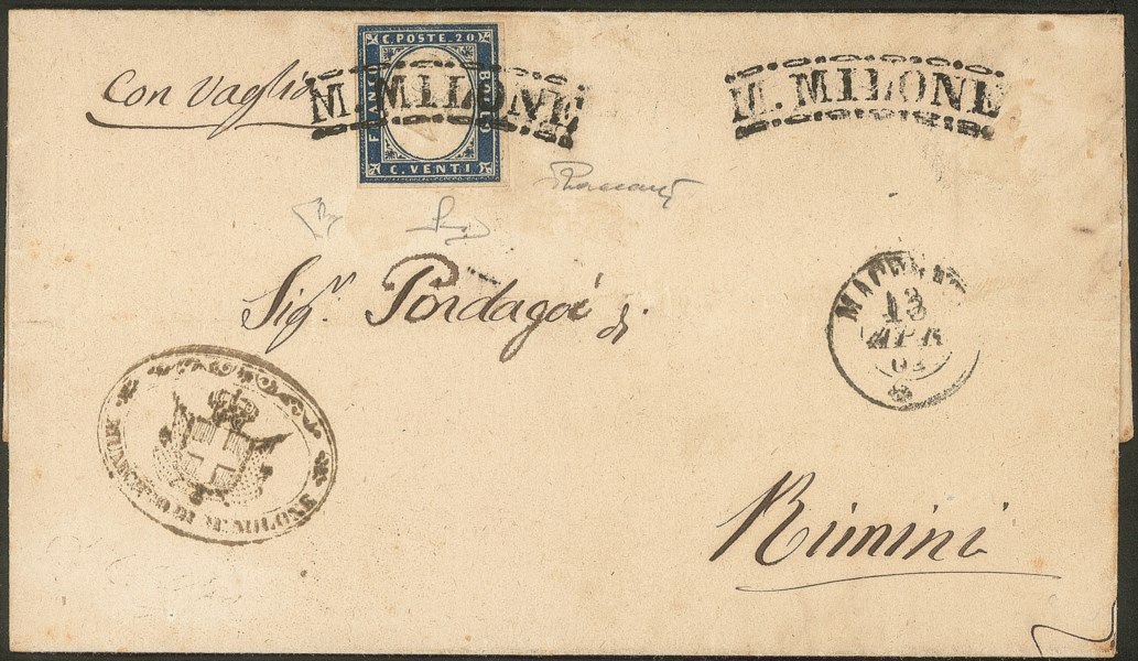 Antichi Stati Italiani - Sardegna - Annullamenti - Lettera da Monte Milone (p. R1) a Rimini 13.4.61