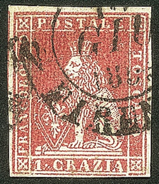 Con ornato superiore sinistro interrotto più coda unita alla linea di riquadro e T di Toscana con baffo - usato - molto bello - cert. Biondi
