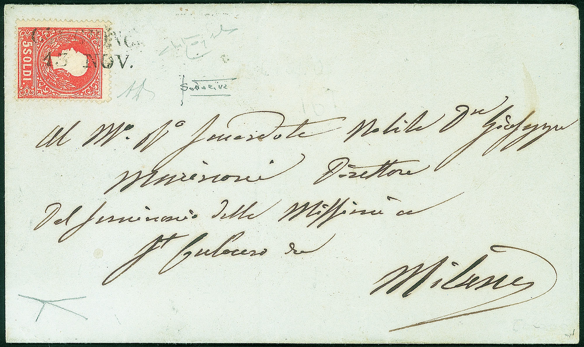 Lettera affrancata con 5 soldi rosso chiaro (25a) I tipo per Milano del 13.11.58 - molto bella - A. Diena + Raybaudi + cert. Sottoriva + cert. Bottacchi