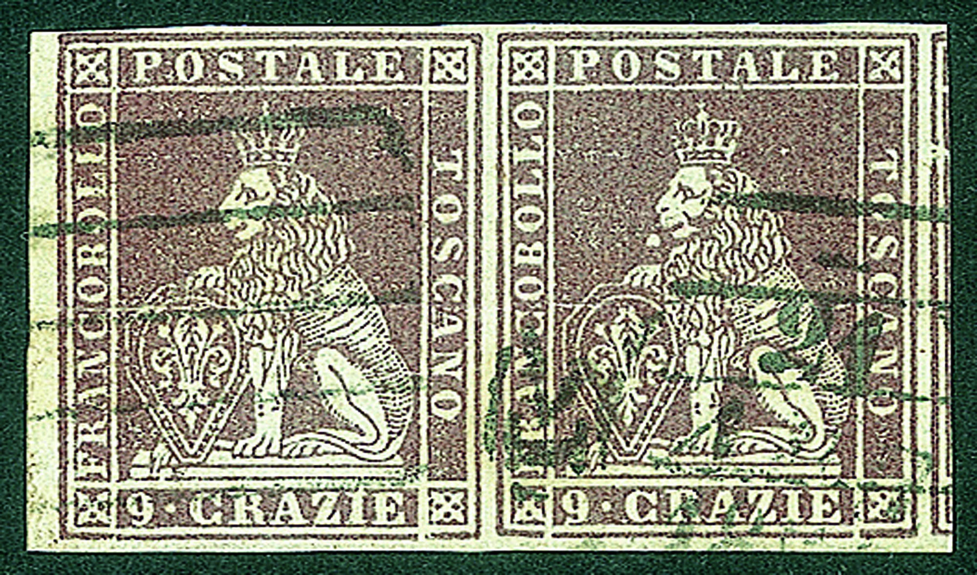 Antichi Stati Italiani - Toscana - Difetti di cliché - 1851 - Bella coppia bordo di foglio del 9 crazie bruno violaceo