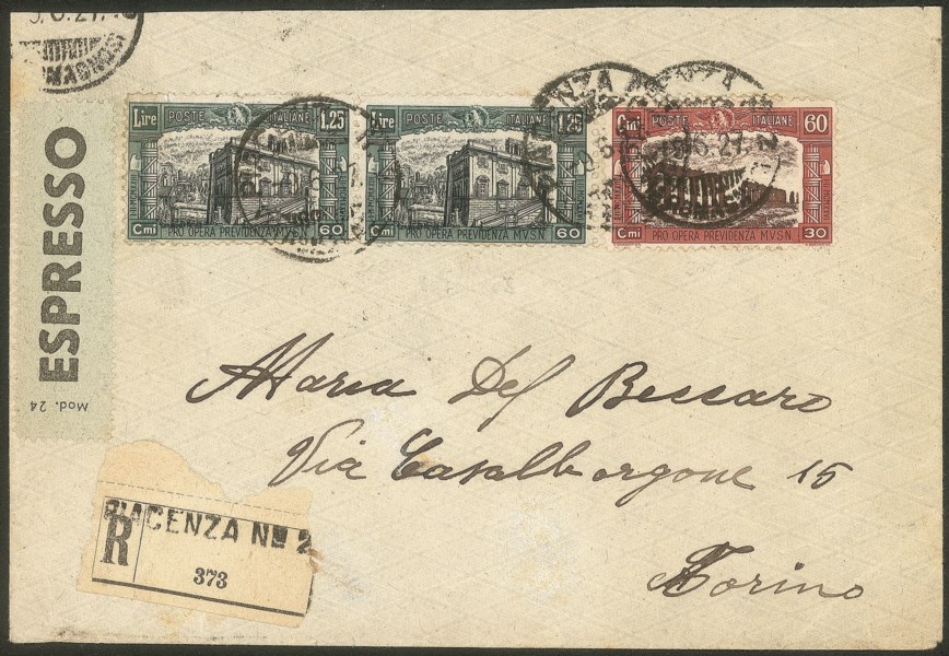 Su raccomandata espresso da Piacenza a Torino del 9.6.27 - molto bella