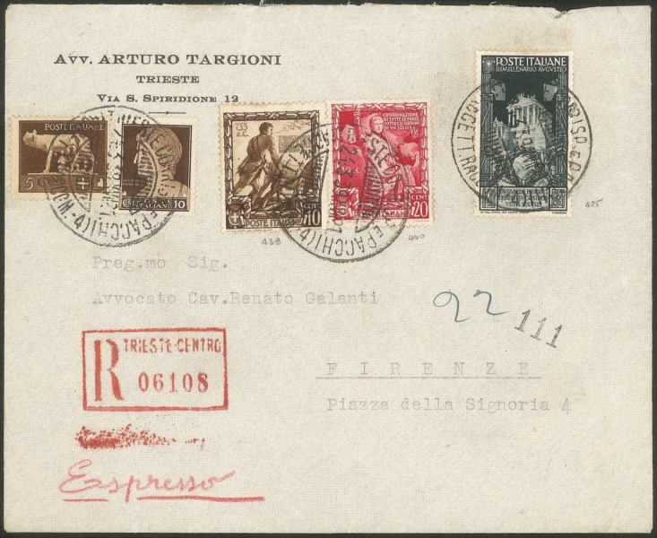 + Impero 10 cent + 20 cent (425 + 439/440) + complementari su raccomandata espresso da Trieste a Firenze del 24.3.39 in tariffa - molto bella