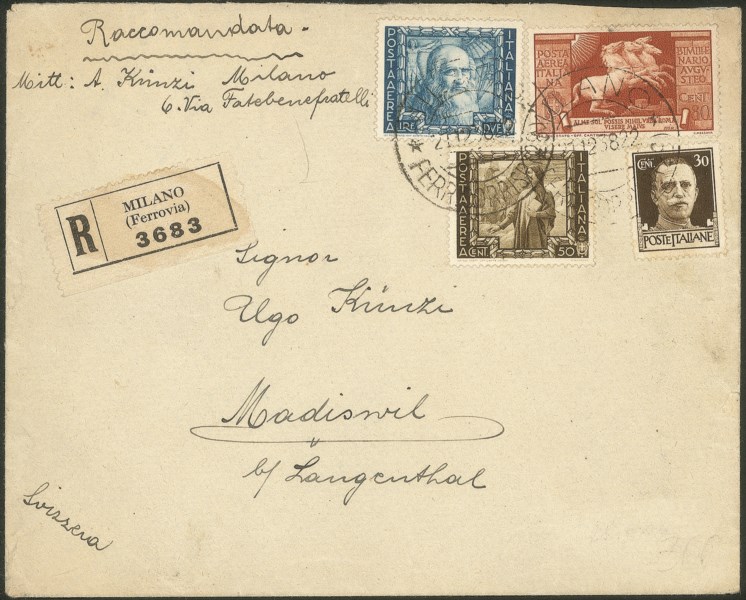 + Augusto 80 cent (108) + complementare su busta raccomandata da Milano per la Svizzera del 21.12.38