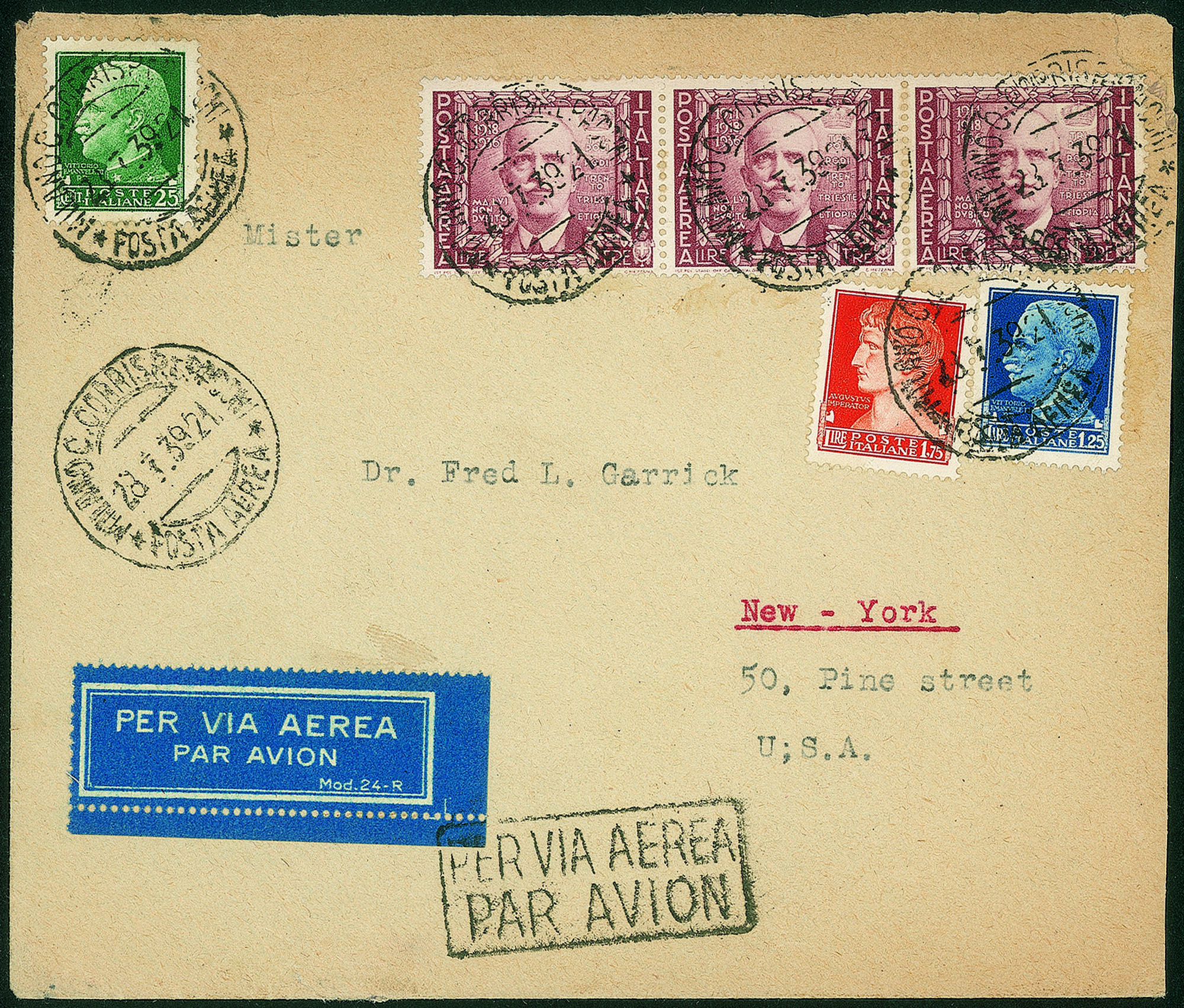 Striscia di tre + complementari su aerogramma da Milano a New York del 28.7.39 - in tariffa - molto bello