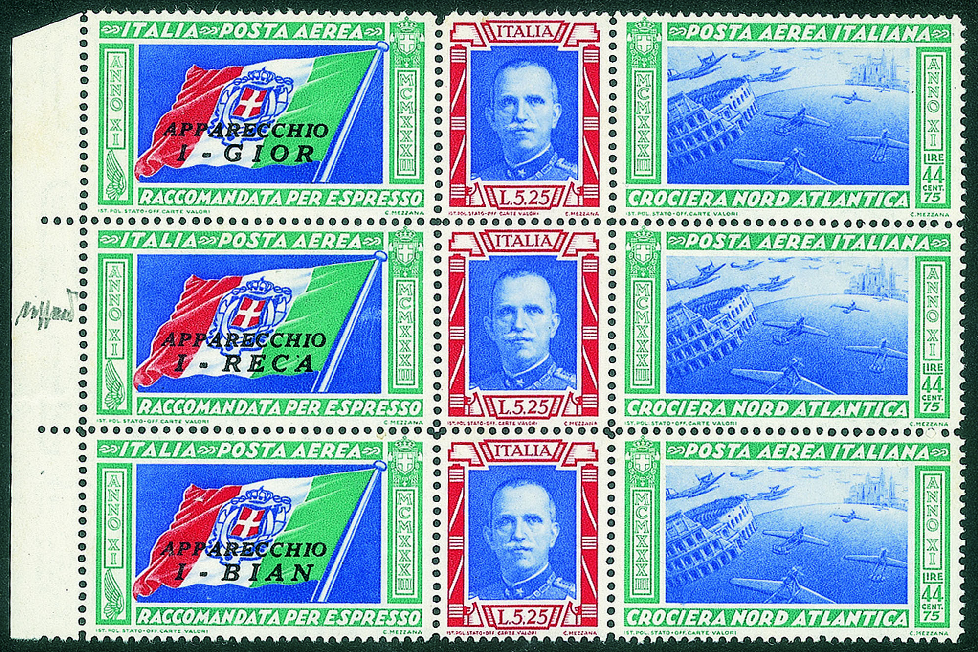 Regno - Vittorio Emanuele III - Posta Aerea e Aerogrammi - 1933 - Bellissimo blocco di tre bordo di foglio dei Trittici I-GIOR/I-RECA/I-BIAN (51/52 B-g-q)