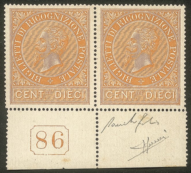 Bordo di foglio con numero di Tavola 86 in rettangolo sull'esemplare di sinistr - discretamente centrati - gomma integra - cert. Sorani + cert. Fabris