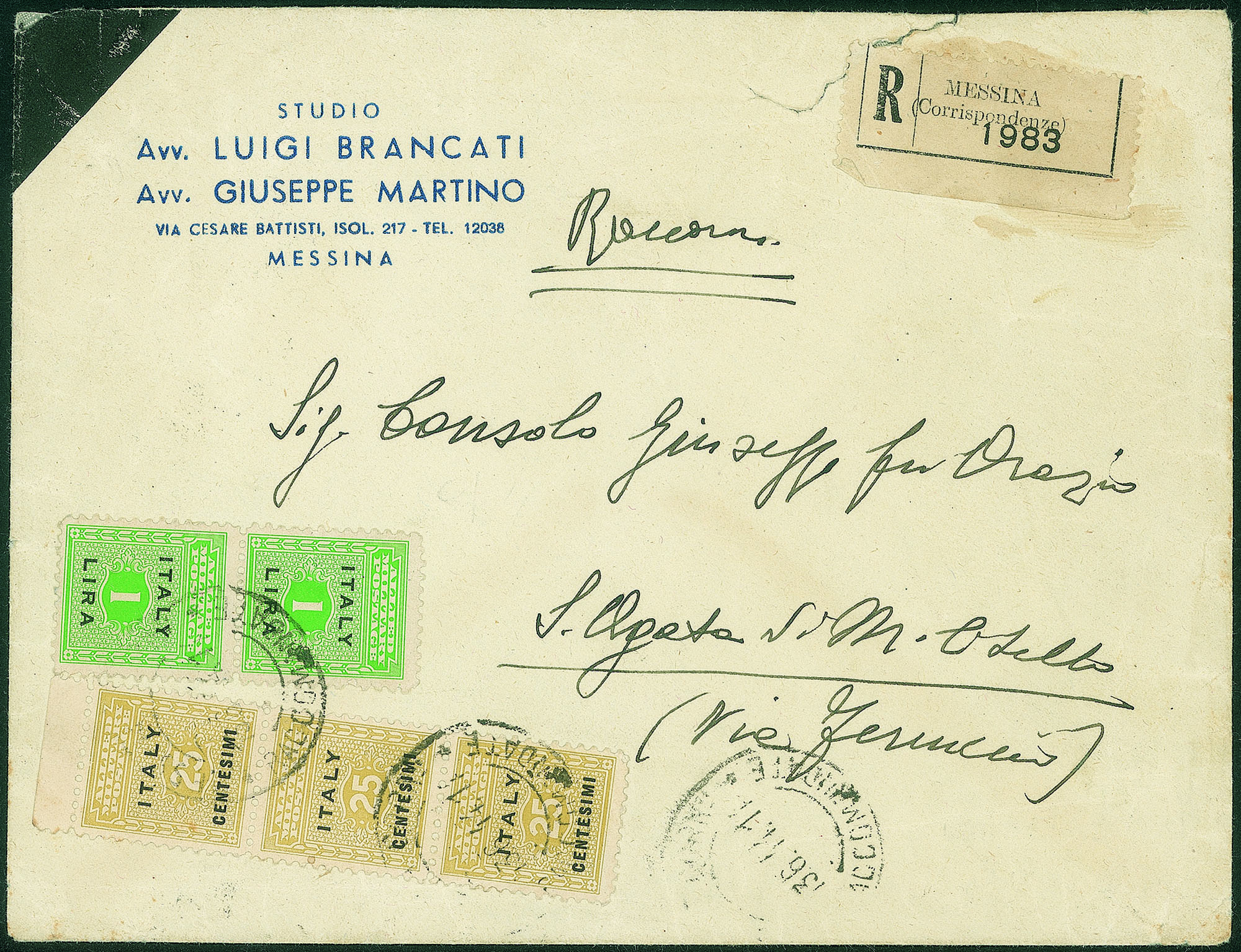 Su raccomandata da Messina a S. Agata Militello del 13.6.44 - in tariffa