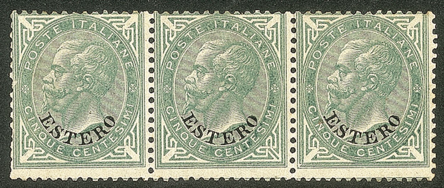 Uffici Postali all'Estero - Levante - Emissioni generali - Striscia di tre del 5 cent. verde grigio, sovrastampato ESTERO
