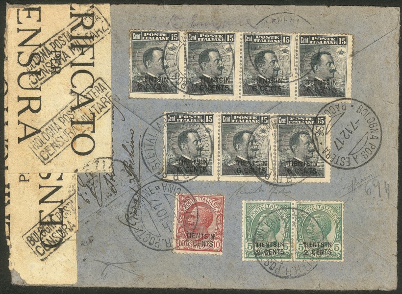 Per un totale di 50 cent da Tientsin a La Spezia del 5.10.17 - splendida e molto rara sia per la qualità di valori della prima emissione sia come multiplo - cert. Sorani + cert. Bottacchi + cert. oro Fabris