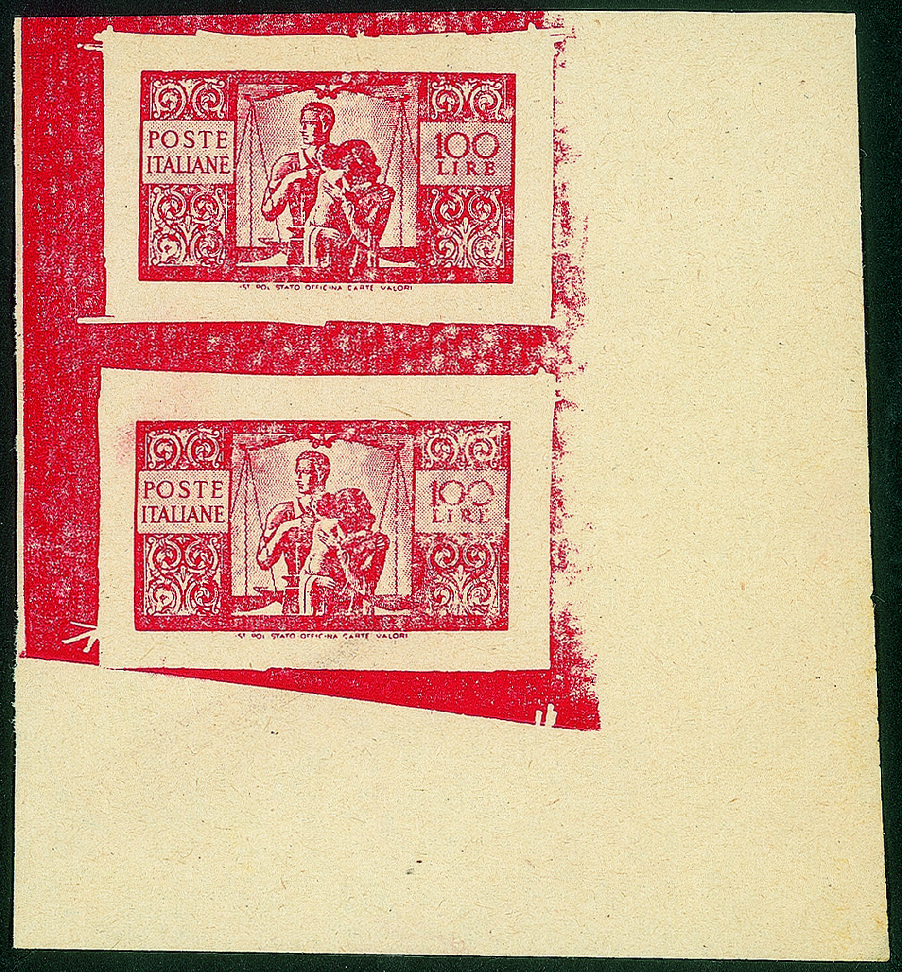Italia - Repubblica - Falsi di Bueons Aires - 1950 - Falsi di Buenos Aires - coppia angolo di foglio del 100 lire Democratica (F565A)