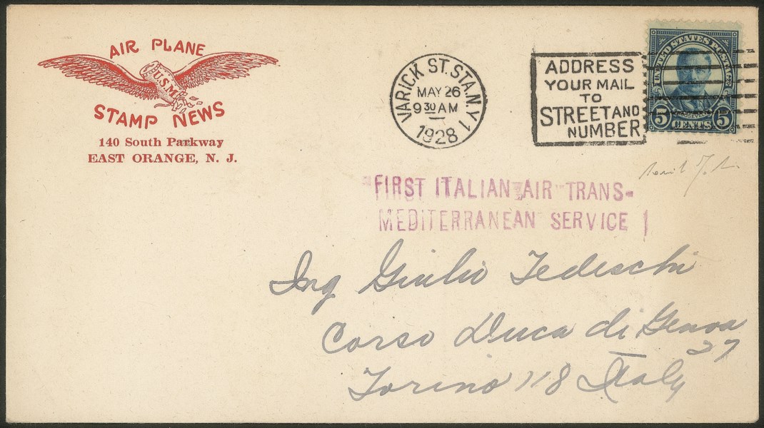 Da New York a Genova del 26.5.28 - timbro violetto 2First Italian Air Trans Mediterranean Service - cert. Fabris