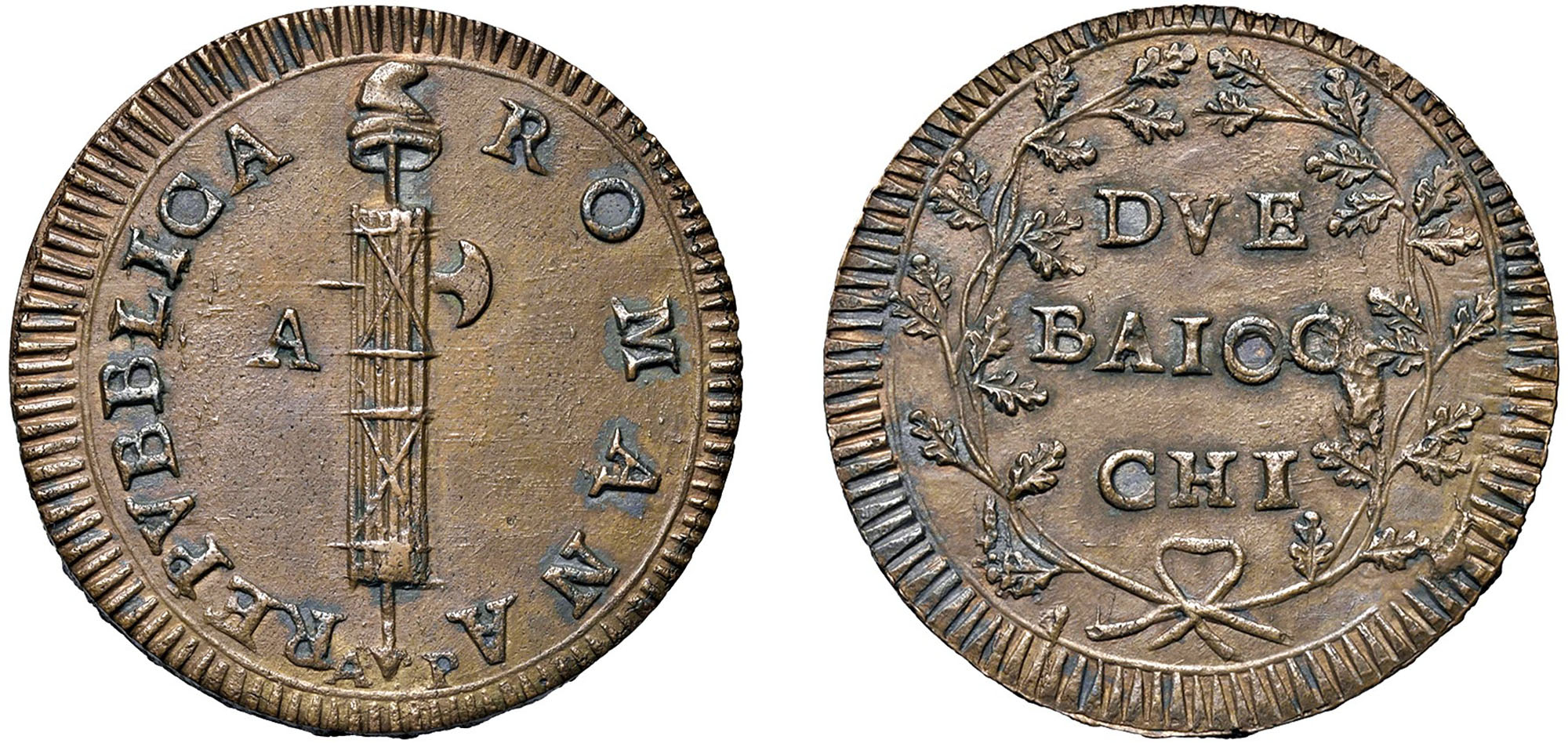 Dritto: Fascio con scure e pileo a destra; a sinistra A, in basso A / P. - Rovescio: Iscrizione tra rami di quercia legati insieme da fiocco.