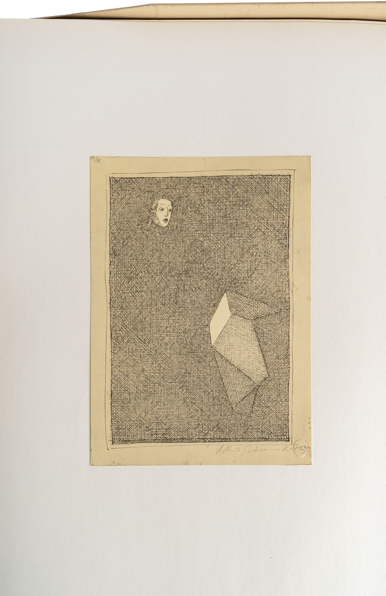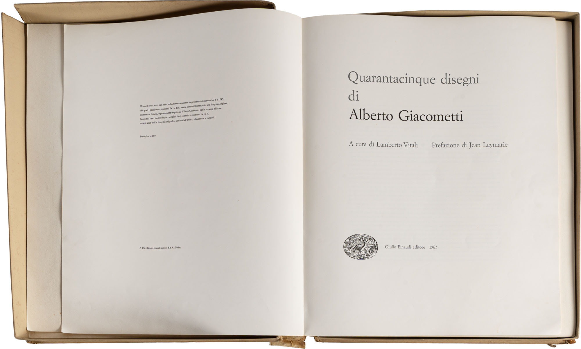 Libro d'artista comprendente 45 fotoriproduzioni di disegni di Alberto Giacometti, es. 680, su una tiratura di 1245 esemplari numerati da 1 a 1245 di cui i primi 100, numerati da 1 a 100, recano contro il frontespizio una litografia originale, numerata e firmata, espressamente eseguita da Alberto Giacometti per la presente edizione. Sono stati tirati inoltre cinque esemplari fuori commercio, numerati romani da I a V, recanti anch'essi la litografia originale, Giulio Einaudi Editore, Torino.