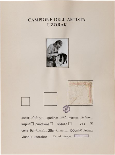 Formulario, china e collage con fotografia e tessuto su stampa serigrafica