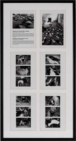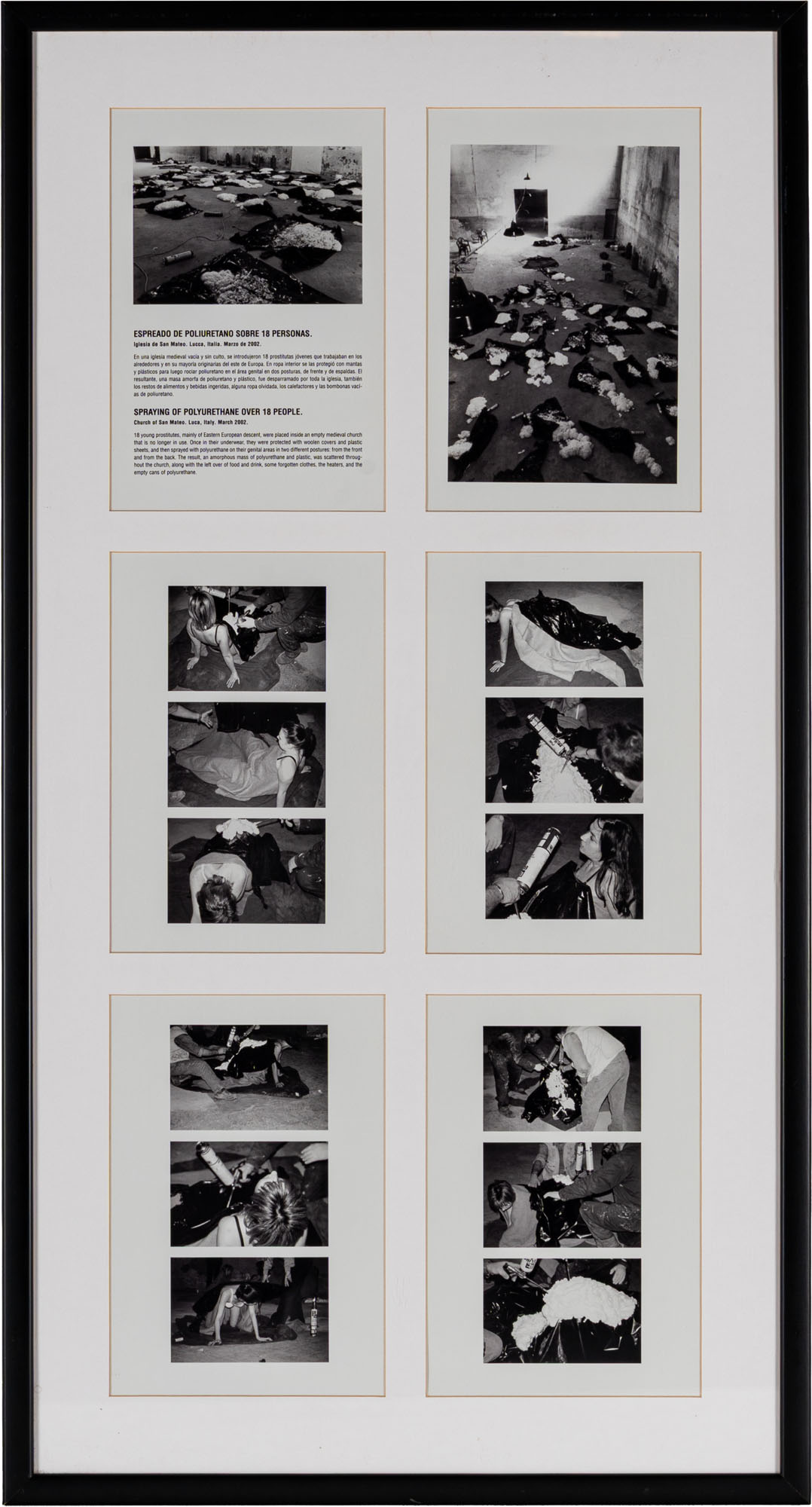 Testo e fotografie in bianco e nero tratte dalla performance Espreado de poliuretano sobre 18 personas tenutasi presso la chiesa di San Matteo, Lucca, marzo 2002, ed. 7/10 su una tiratura complessiva di 10 esemplari + 1 p.a. + 1 copia espositiva