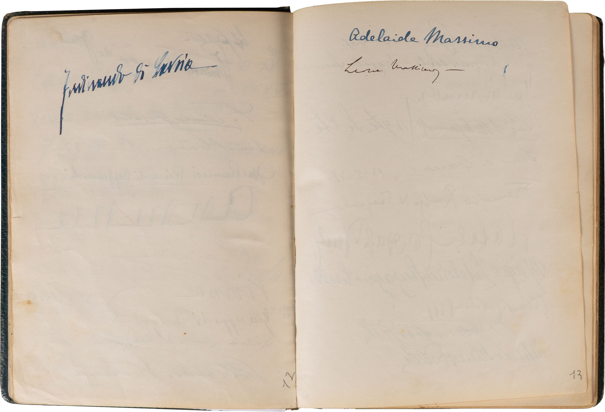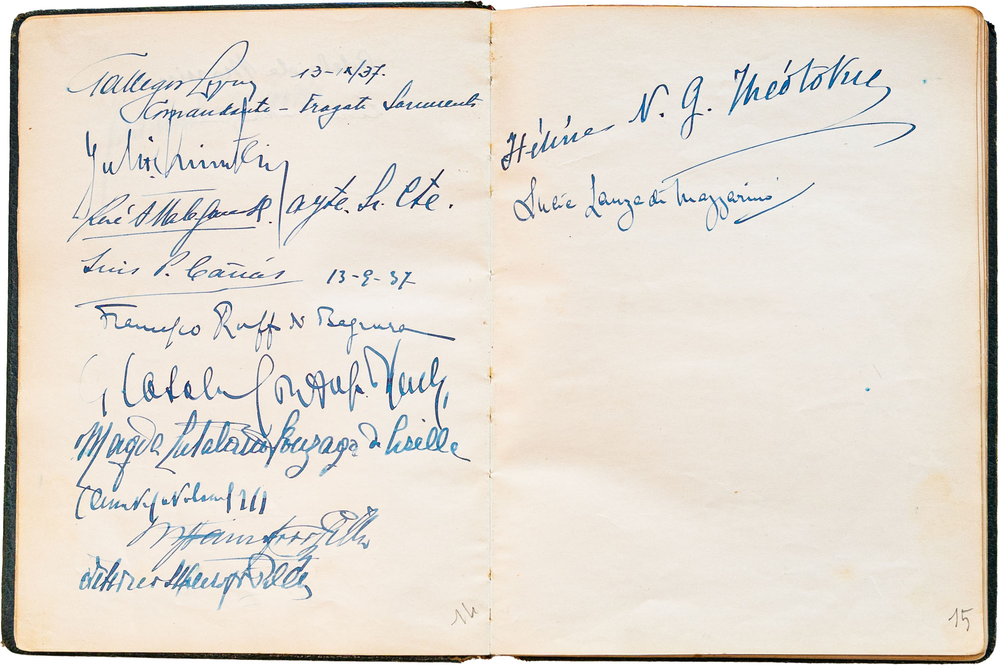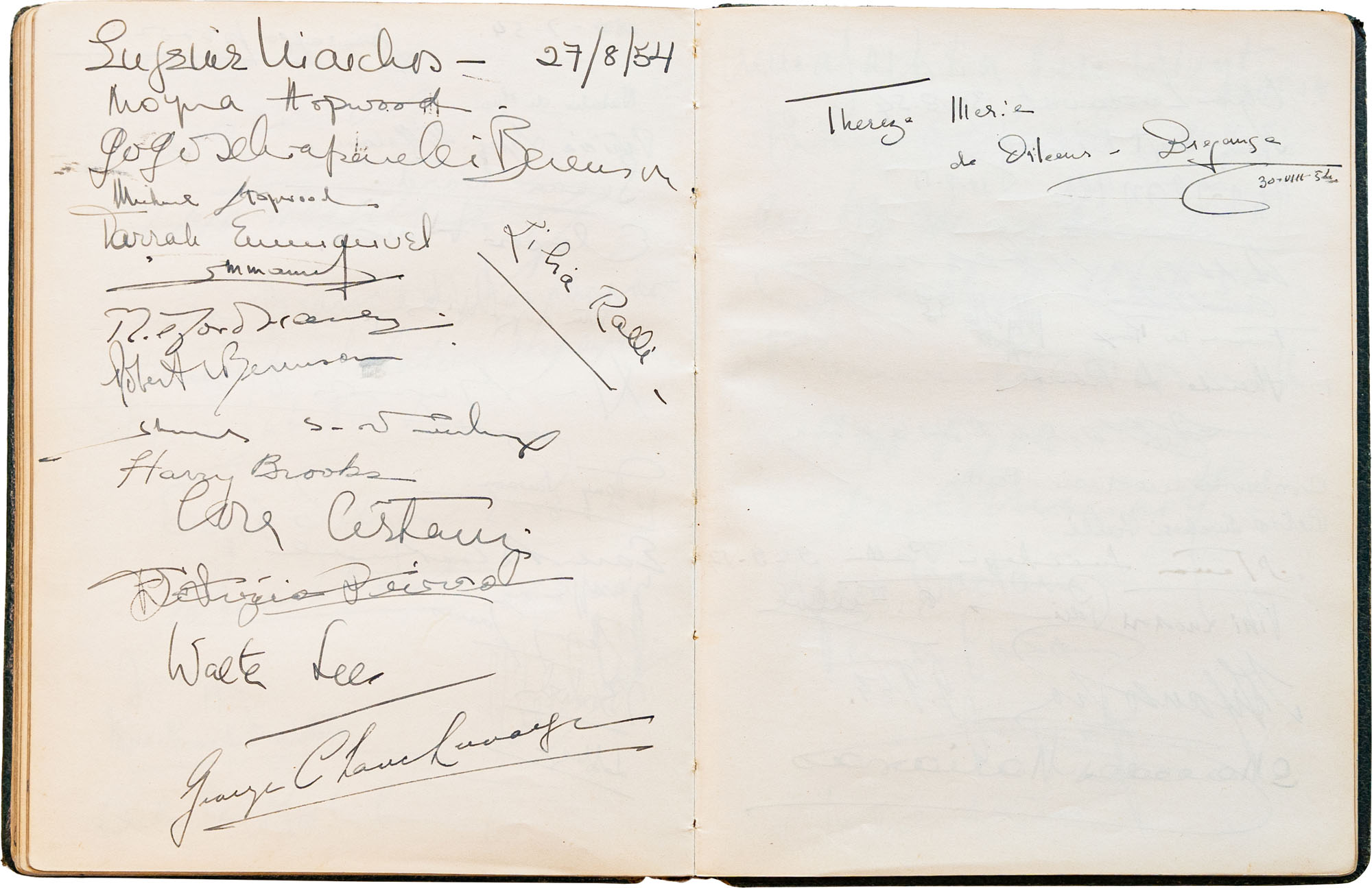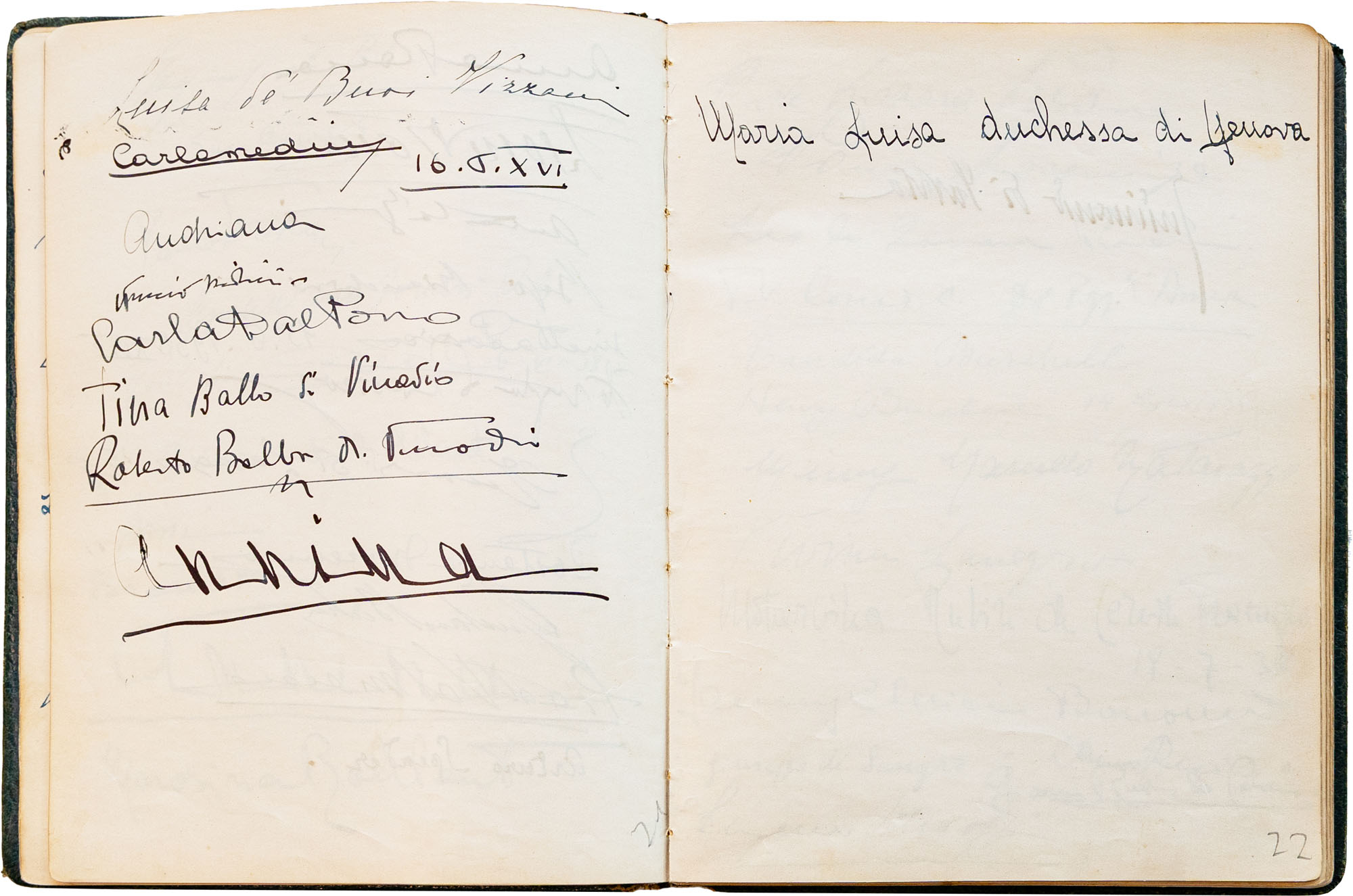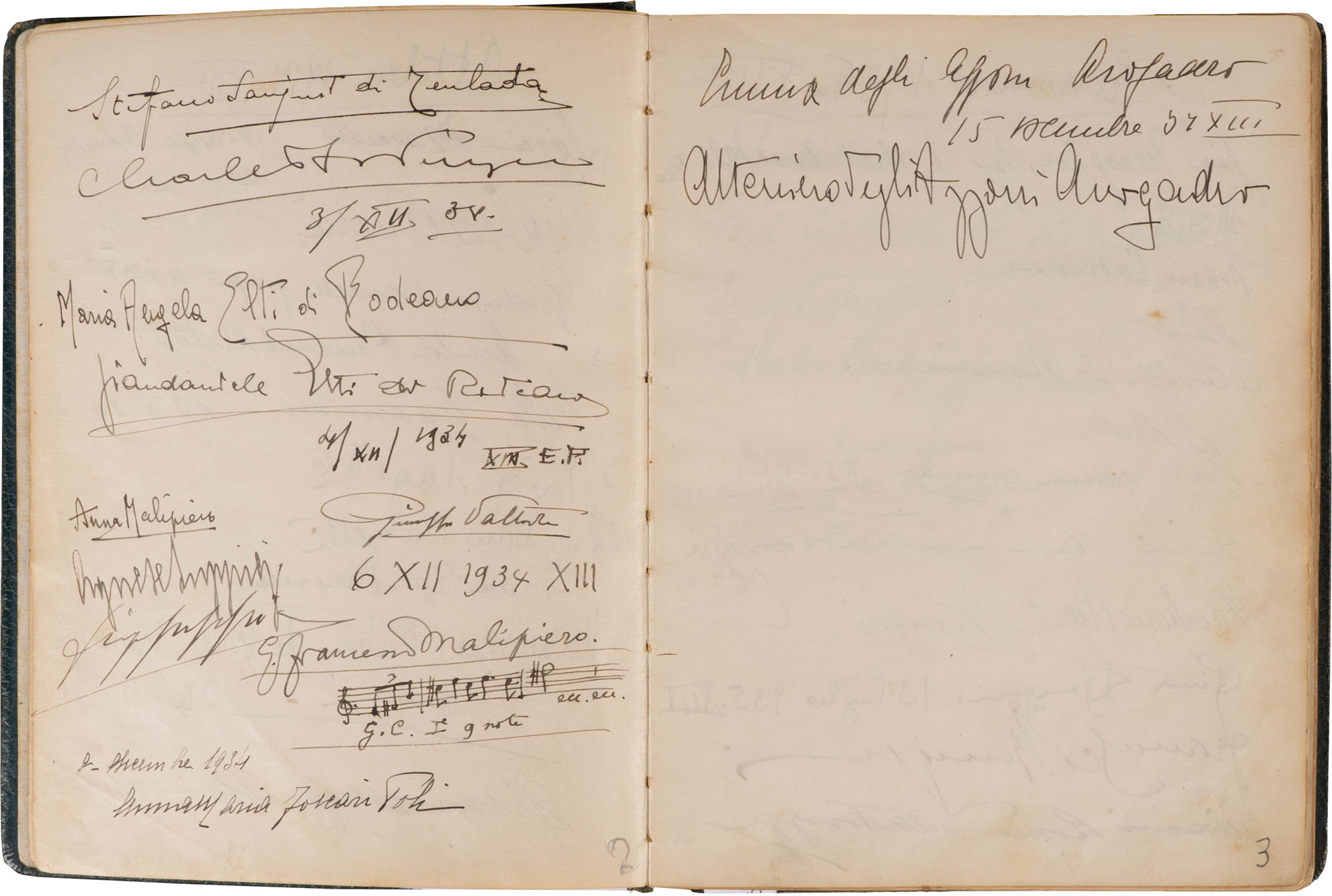 Il libro firma appartenne ad una ricca e importante famiglia veneta, che era solita raccogliere le firme autografe delle personalità che venivano invitate a feste e ricevimenti. Il periodo in cui il libro fu utilizzato va dall'ottobre del 1934 fino all'ottobre del 1955 e tra i più di 2000 autografi originali ne troviamo alcuni di personaggi importanti sia Italia che in tutto il mondo: si va da appartenenti al casato di Savoia, Edoardo VIII d'Inghilterra e sua moglie Wallis Simpson, i figli dello Shah di Persia Reza Pahlavi, Pietro II re di Jugoslavia, nobili di diversi paesi europei, politici e artisti.
