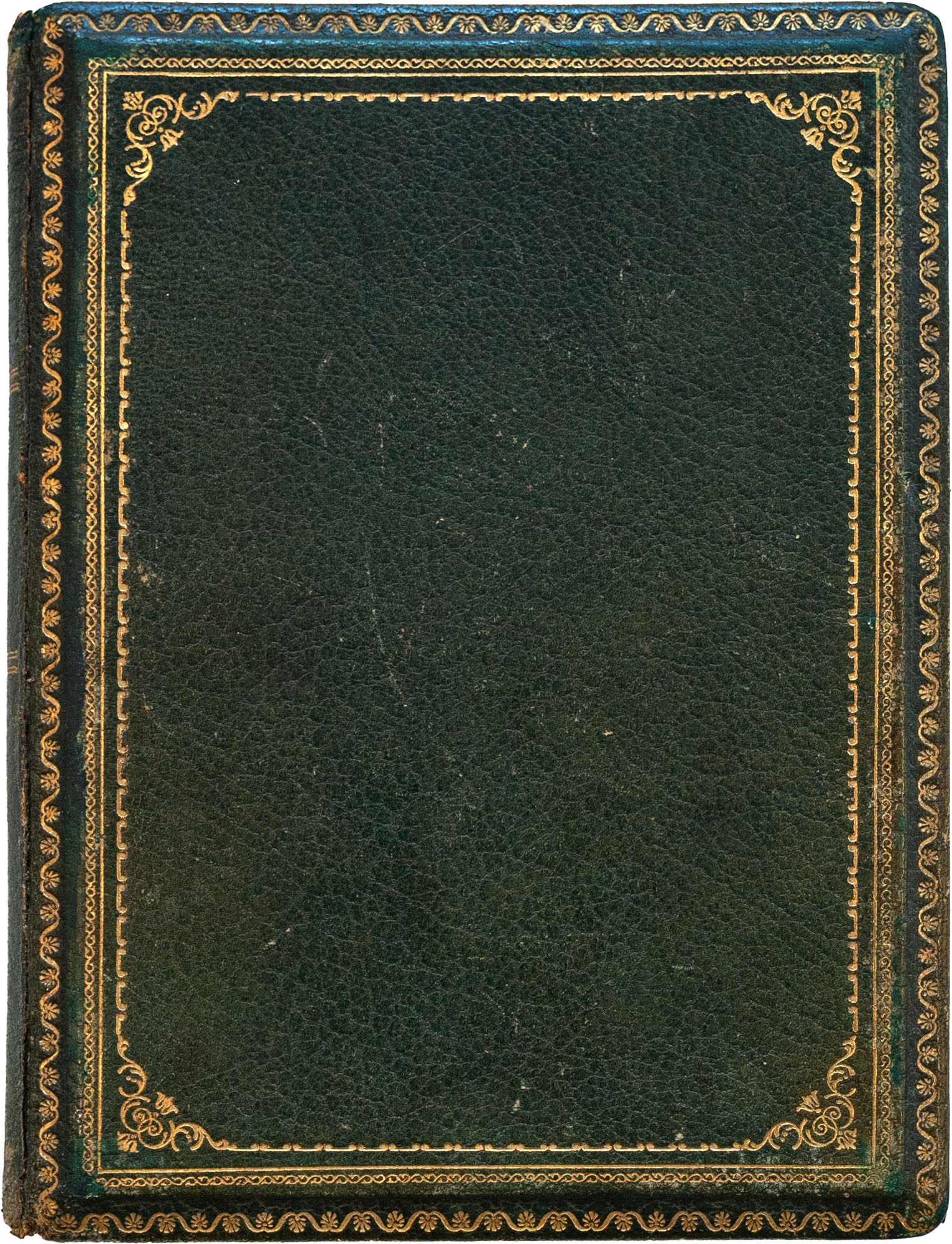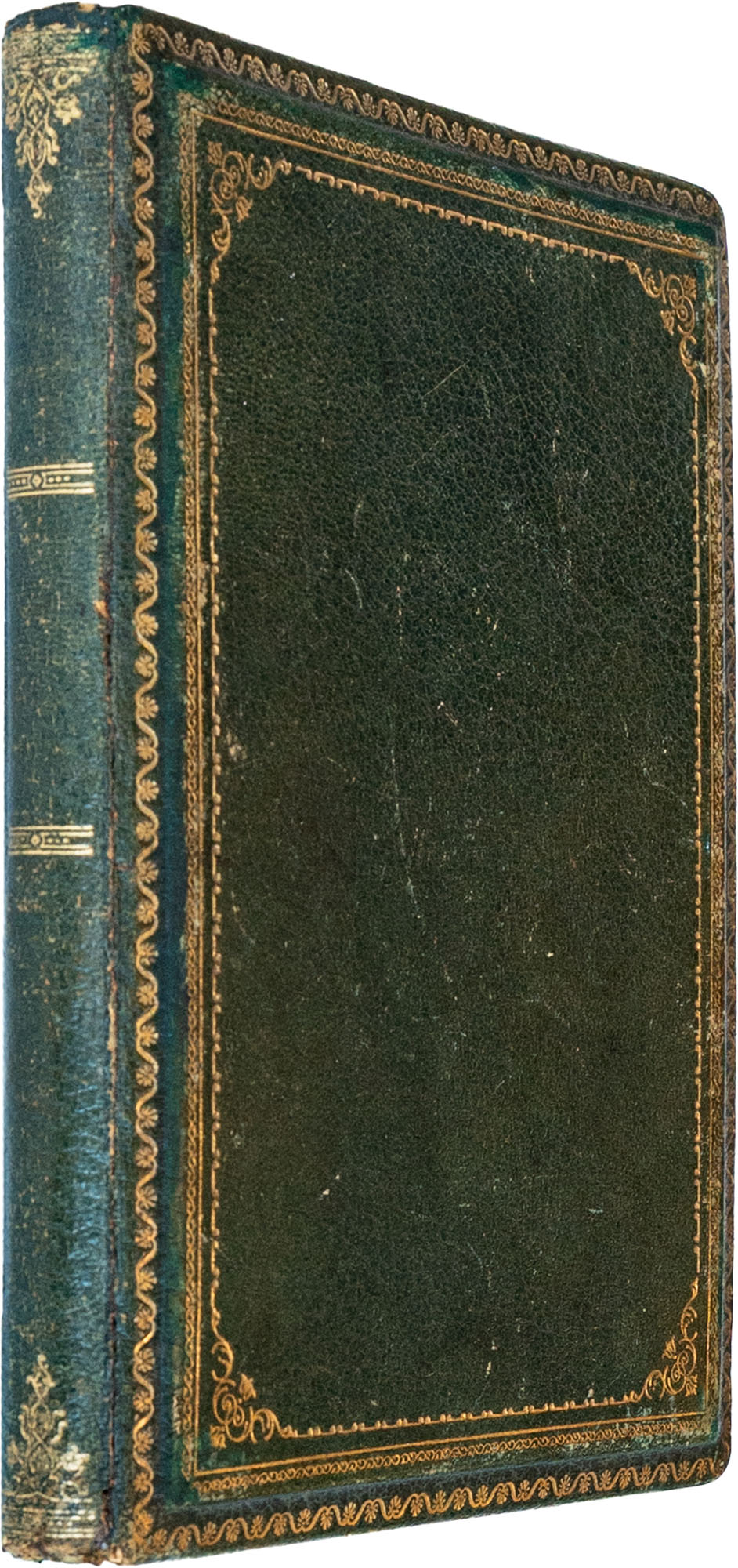 Legatura in piena pelle con tre ricche cornici in oro impresse al piatto anteriore, fregi oro al dorso, decorazione impressa al piatto posteriore, tagli dorati