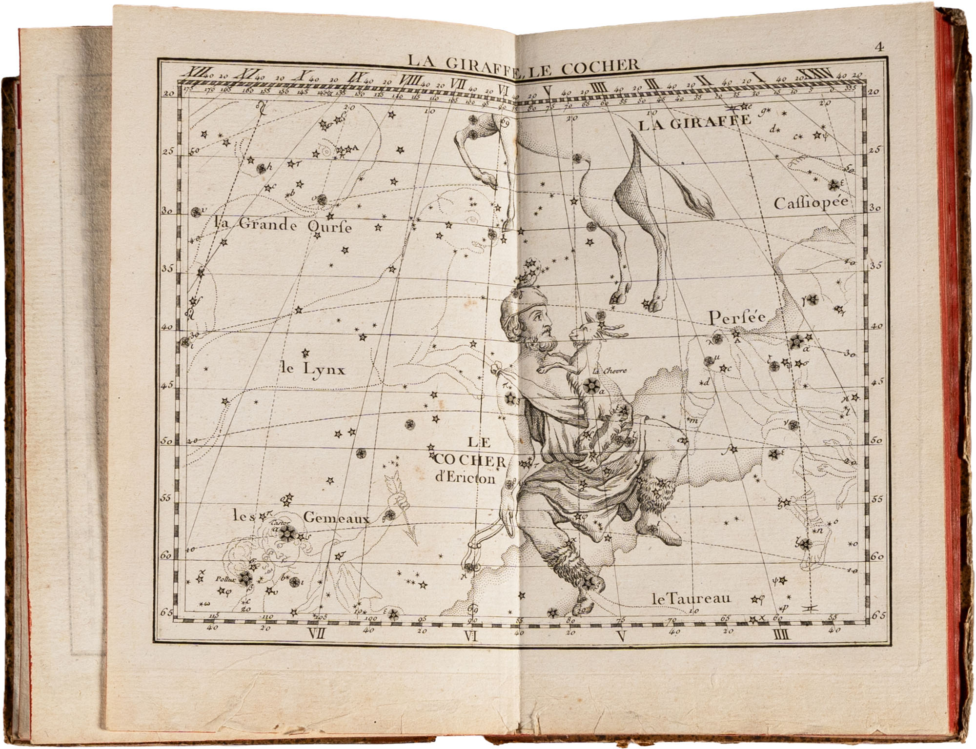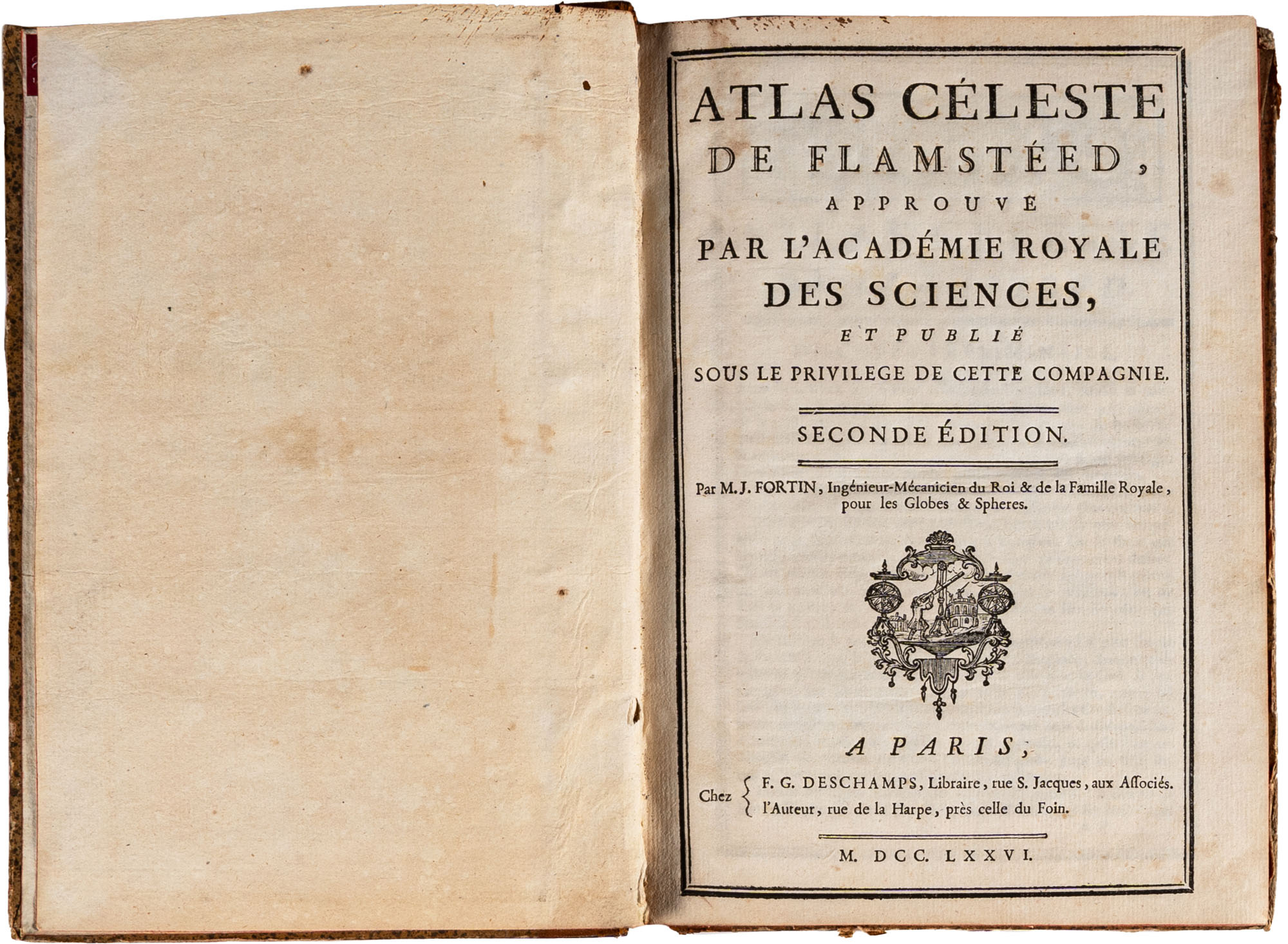 Celebre atlante celeste per opera di John Flamsteed, astronomo della casa Reale d'Inghilterra e fondatore della specola di Greenwich, nella versione del francese Fortin. Le tavole, ci mostrano le varie costellazioni con le immagini mitologiche, queste sono 26, le altre con Emisfero Boreale, 2 con l'Emisfero Australe, 1 col Planisfero
