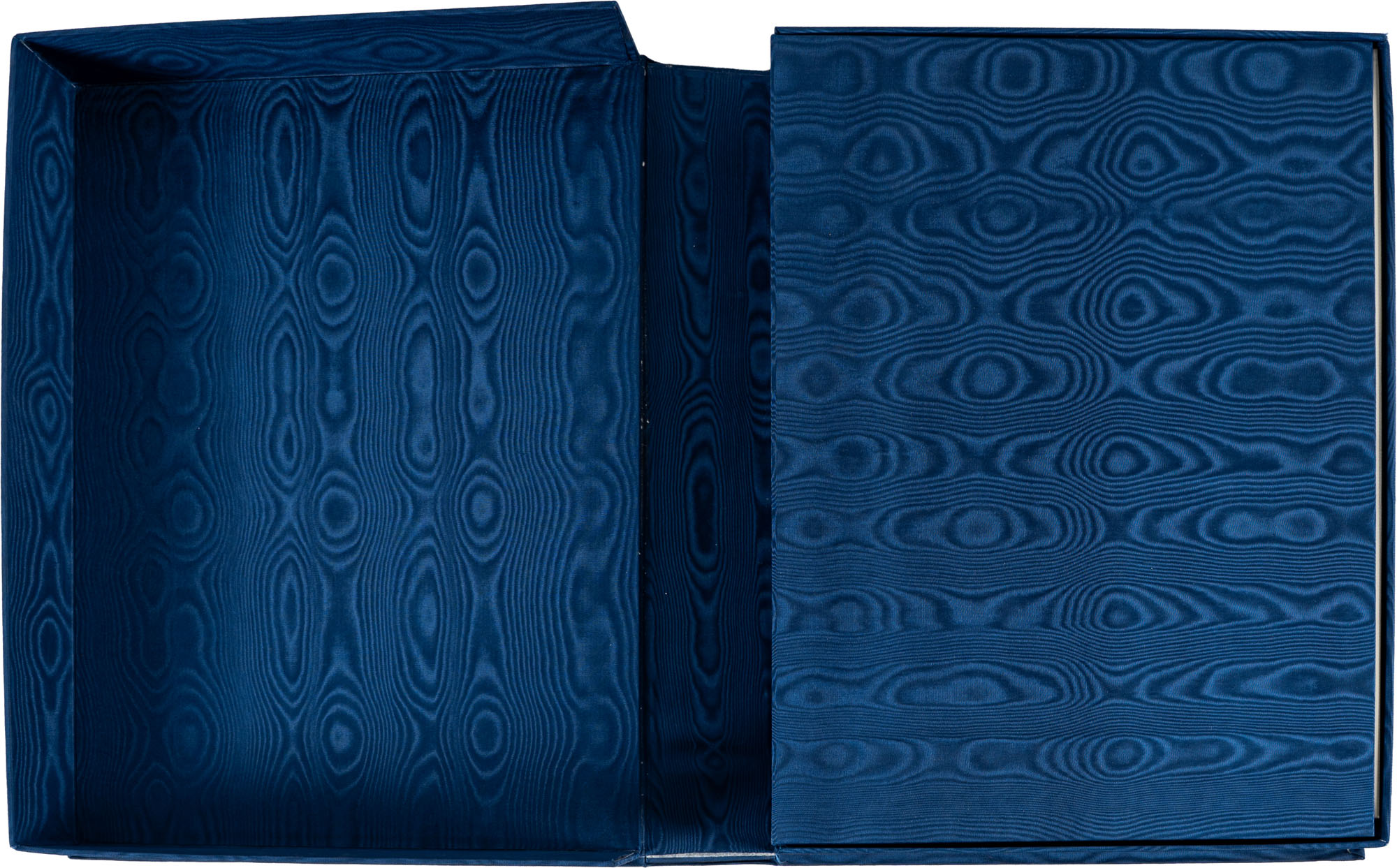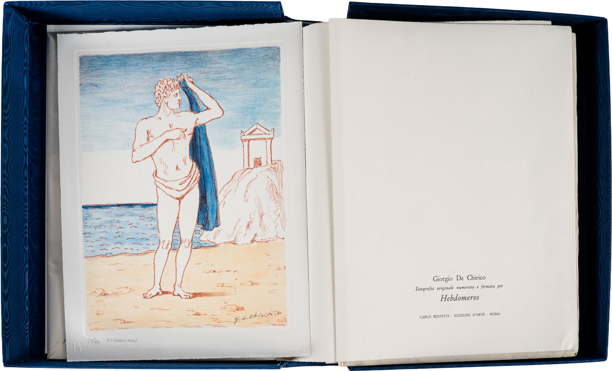 Esemplari sciolti, con copertina originale in cartonato che riproduce al piatto anteriore una litografia di De Chirico, e in custodia rigida in seta blu con titolo in oro al dorso