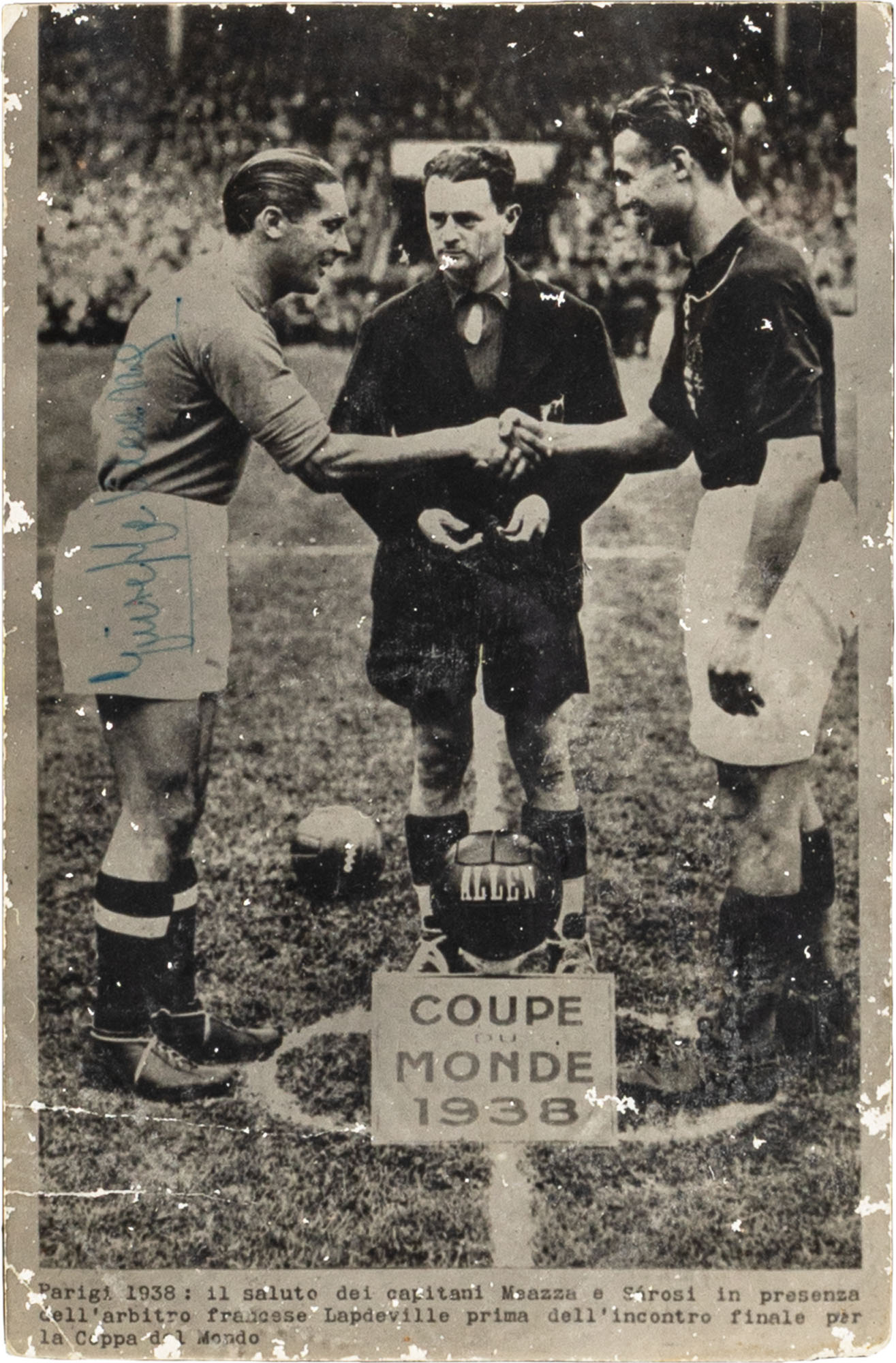 Fotografia originale dello scambio dei saluti dei capitani delle due squadre che si contesero il titolo, Giuseppe Meazza per l'Italia e György Sárosi per l'Ungheria