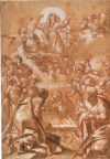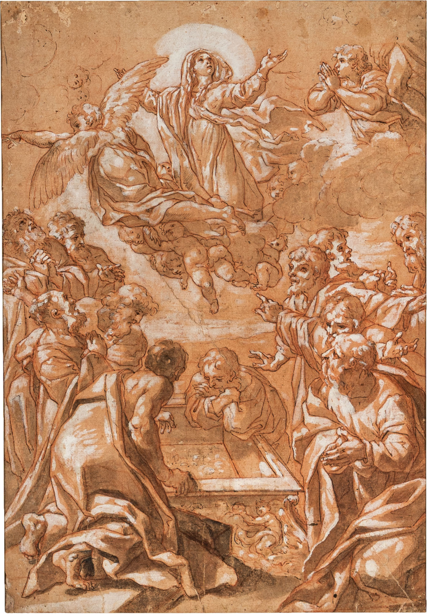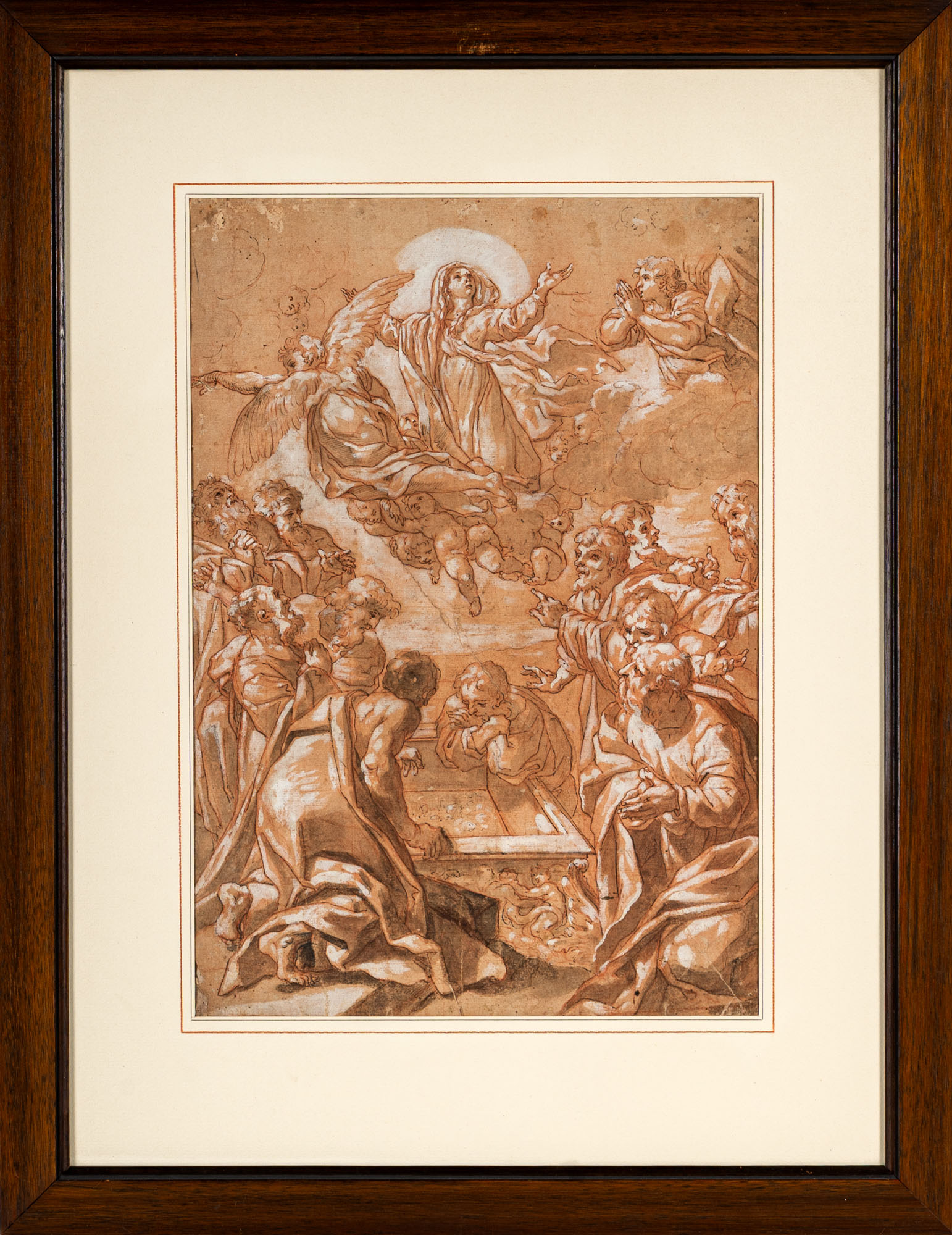 Penna, inchiostro bruno, matita rossa, bistro e biacca