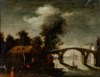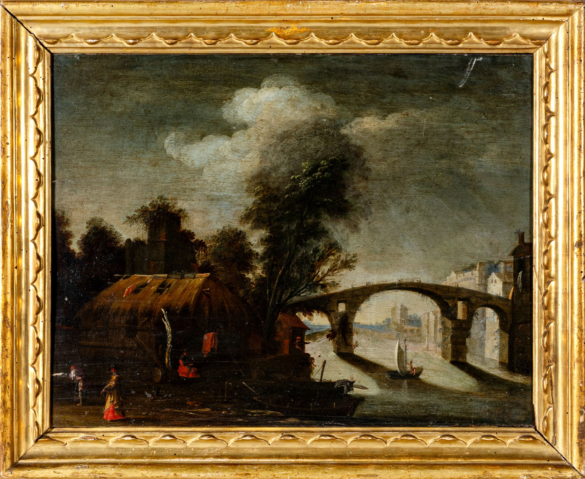 Scuola toscana del secolo XVII - Paesaggio fluviale con figure e imbarcazioni
