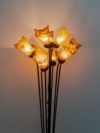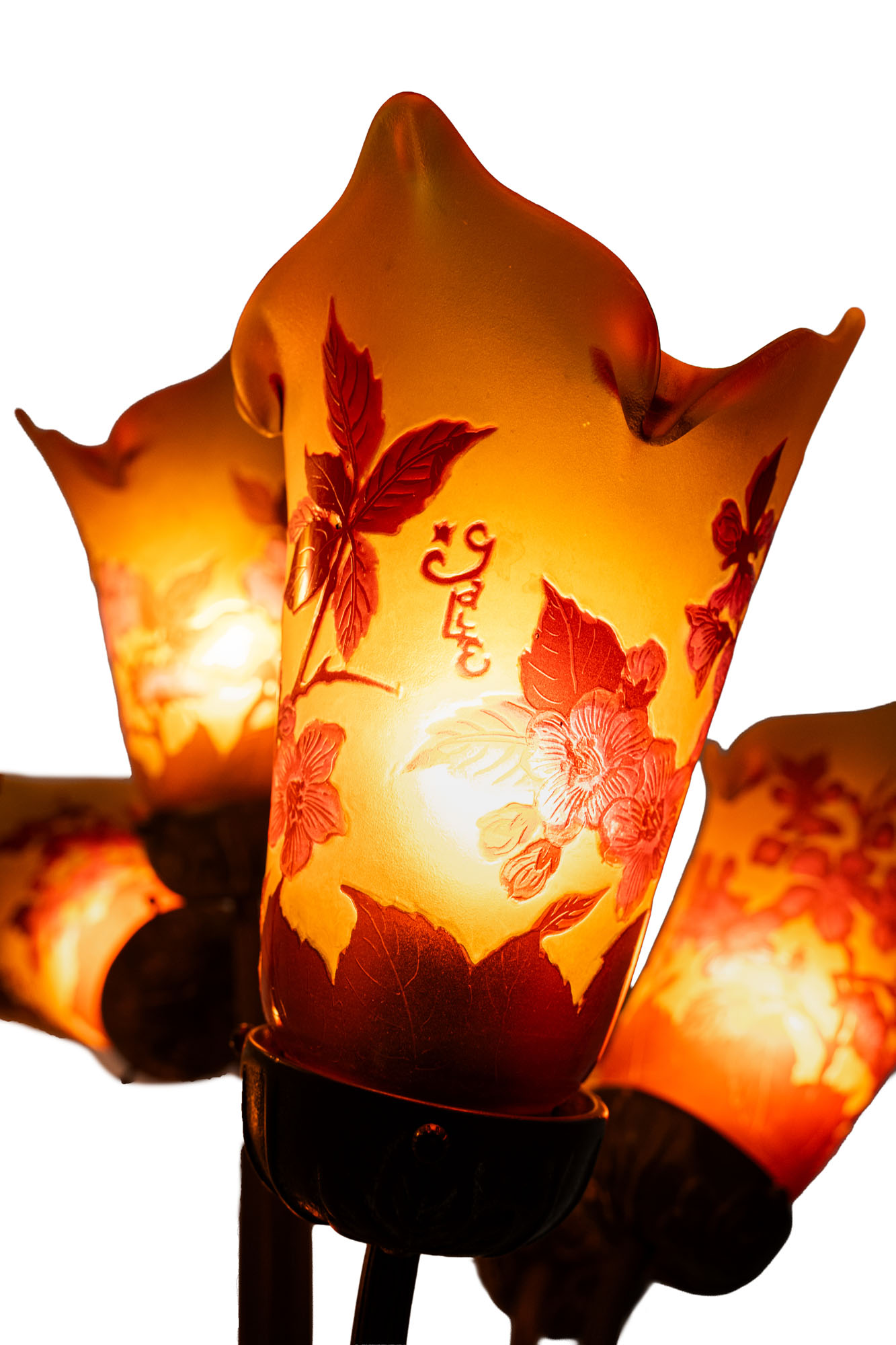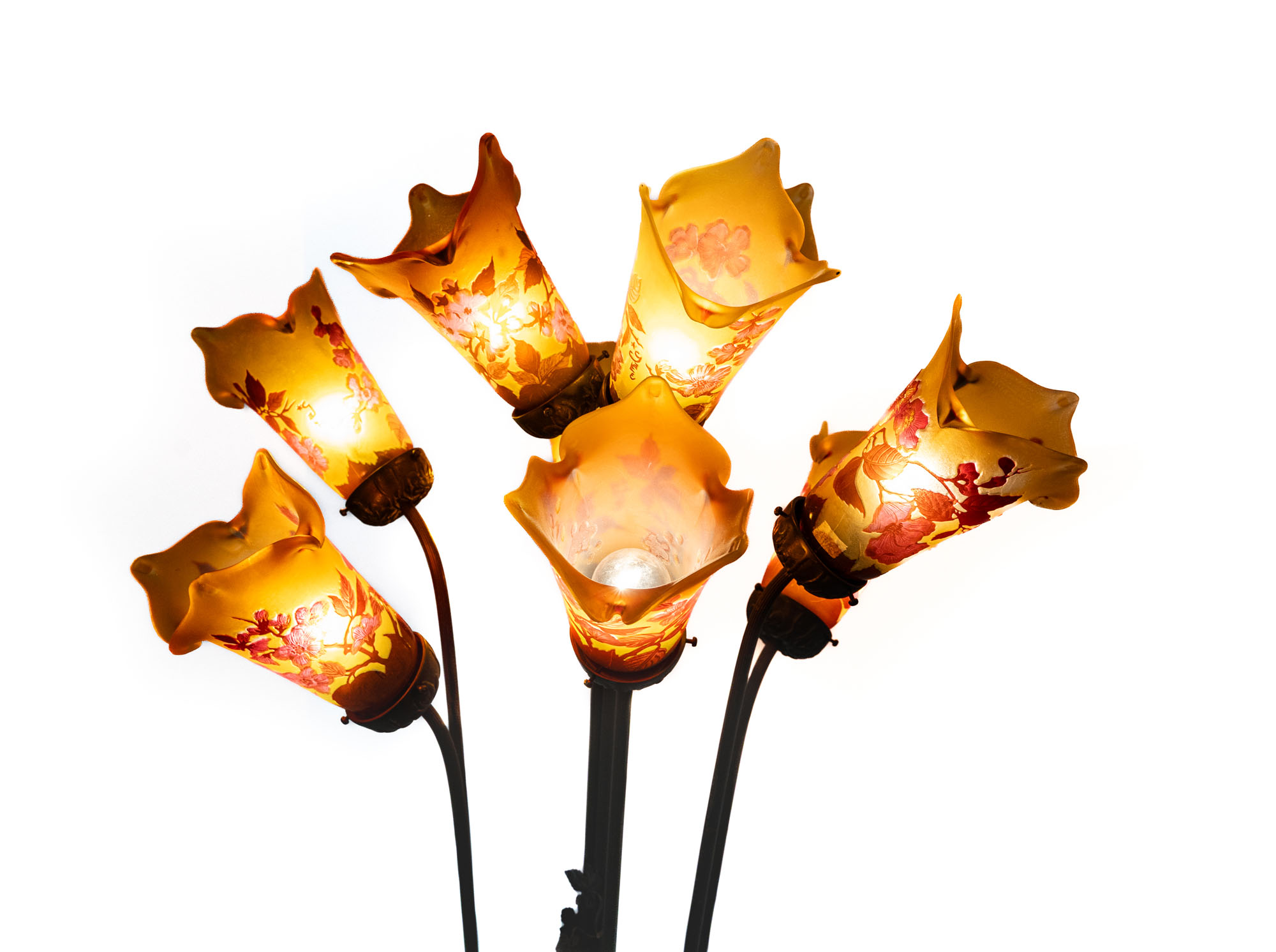 Alto fusto con nove bracci in ferro lavorato con diffusori in vetro con decorazione floreale a cammeo